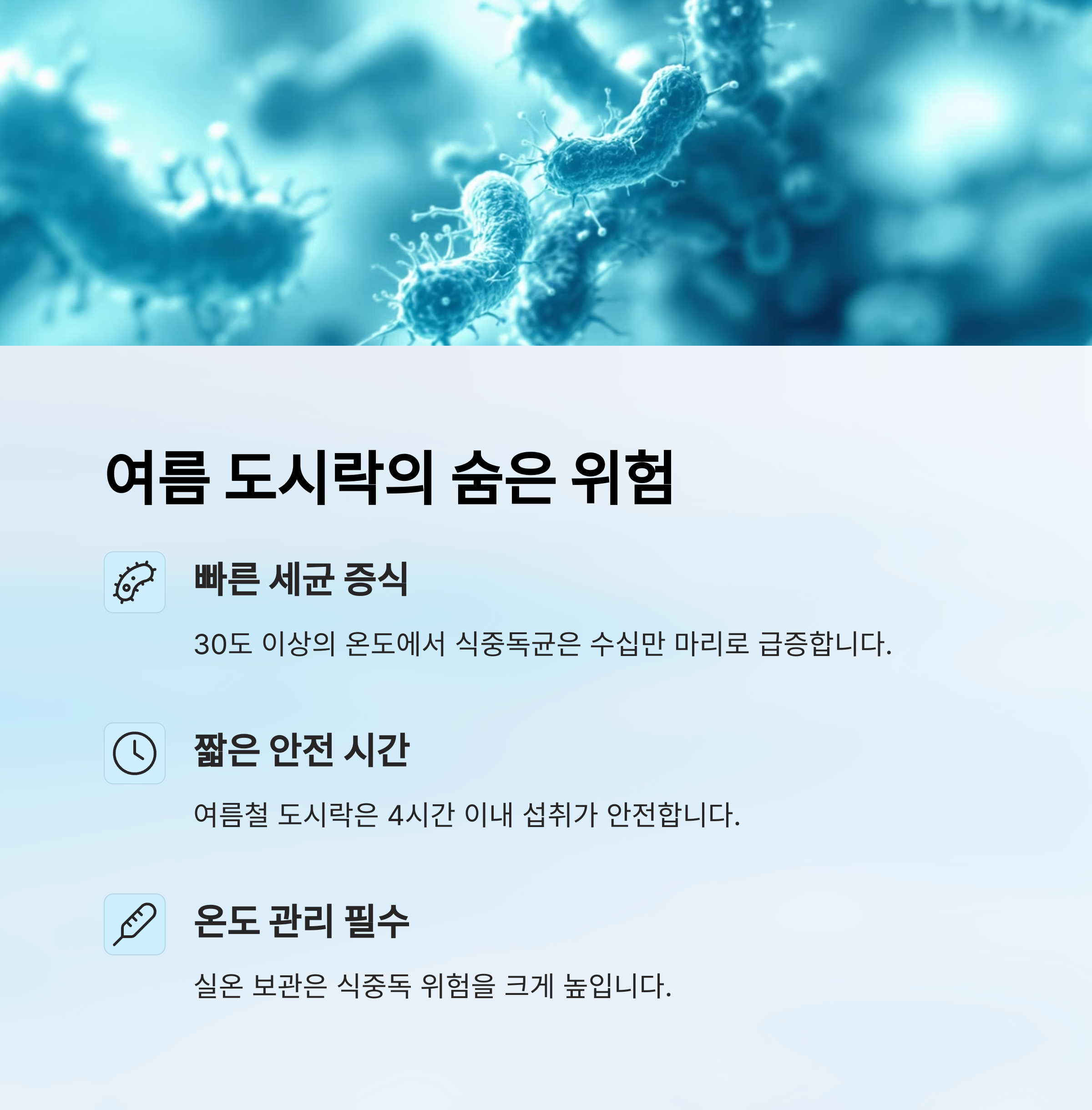 ☀️ 여름은 도시락을 싸기 좋은 계절 같지만, 사실 가장 위험한 계절이기도 해요. 기온과 습도가 높아지면서 식중독균이 활발히 증식하거든요. 특히 도시락처럼 조리된 음식을 몇 시간 동안 실온에 두는 상황에서는 위험성이 더욱 높아져요.