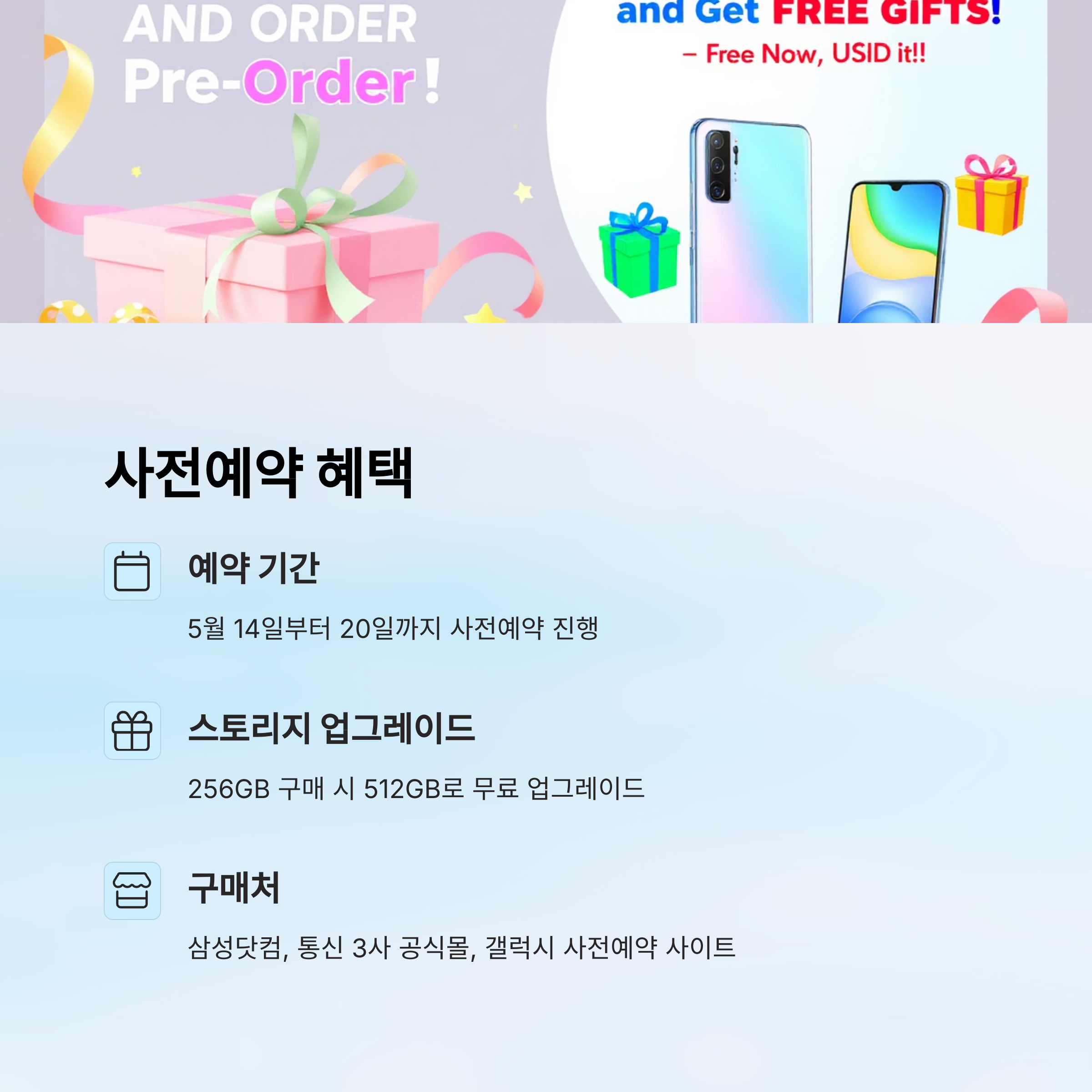 현재 5월 14일부터 20일까지 사전예약이 진행 중이며, 사전예약자에게는 다양한 혜택이 주어지고 있어요. 대표적인 혜택 중 하나는 ‘더블 스토리지 업그레이드’인데, 256GB 모델 구매 시 512GB로 무료 업그레이드 해준답니다!