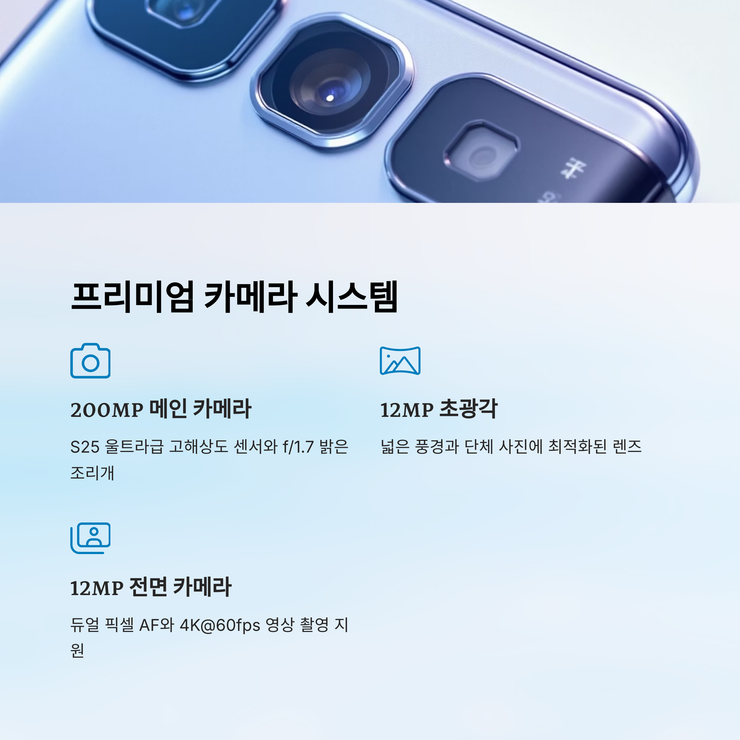 갤럭시 S25 엣지는 5.8mm라는 초슬림 디자인 안에 고성능 카메라 시스템을 꽉 채워 넣었어요. 특히 2억 화소(200MP) 메인 카메라가 탑재되어 있다는 점이 가장 눈에 띄어요. 이건 S25 울트라 모델과 동일한 수준의 센서로, 프리미엄 라인업 못지않은 성능을 보여줘요.
