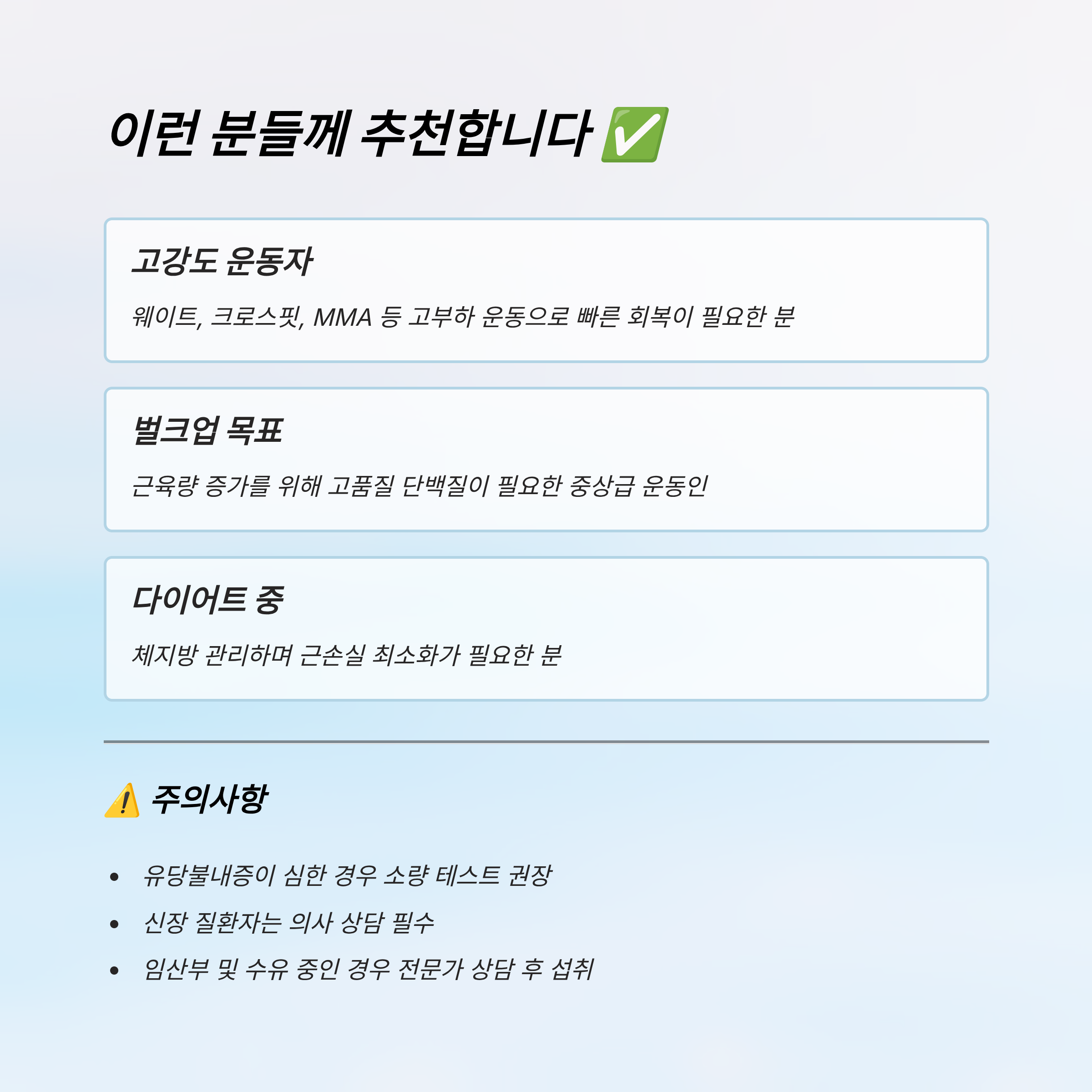 | 비추천 대상 | 유당불내증이 심한 사람, 임산부 및 수유 중, 신장 질환자, 단백질 과민 반응자 |