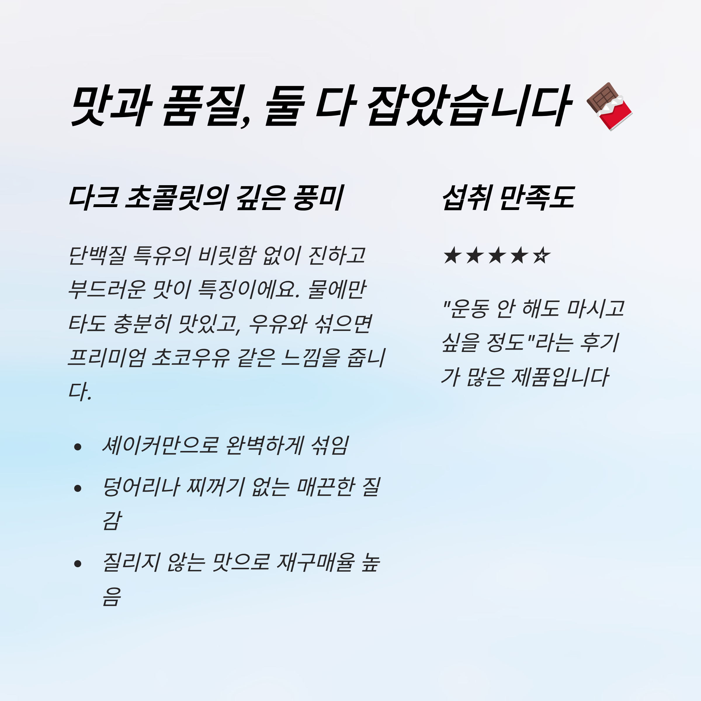 초콜릿 맛도 달지 않으면서 진해서 운동 후에도 물리지 않아요. 입자도 곱고 쉽게 섞여서 셰이커 하나만 있어도 OK!