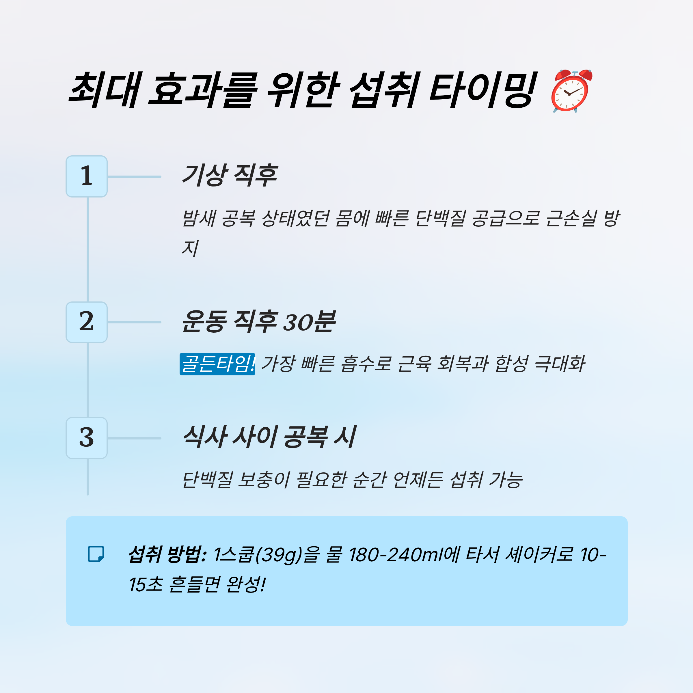 | 기상 직후 | 근손실 방지 | 1/2~1스쿱 | ★★★★☆ |