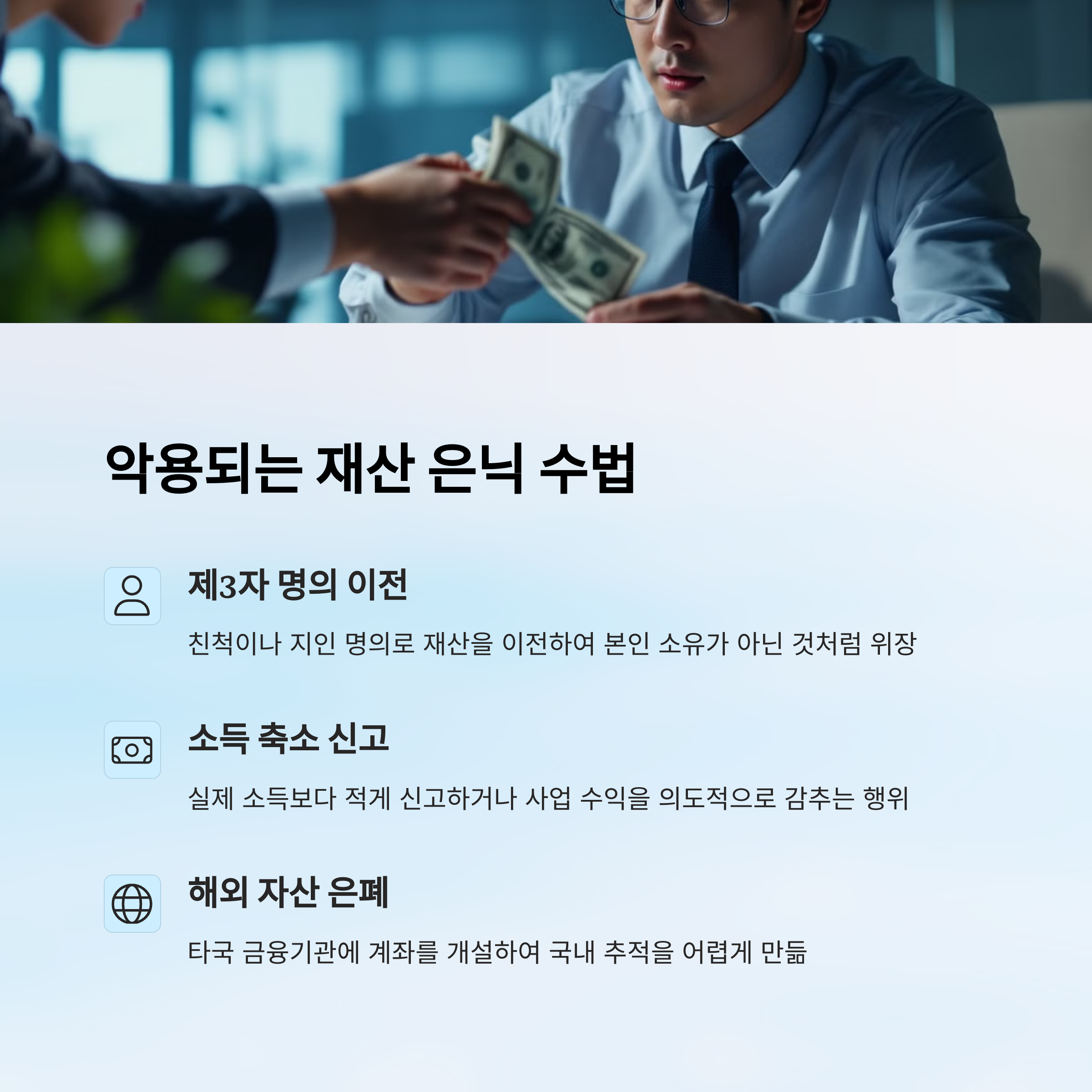 재산을 숨기는 수법은 생각보다 교묘하고 다양해요. 단순히 통장에 돈을 안 넣는 수준이 아니에요.