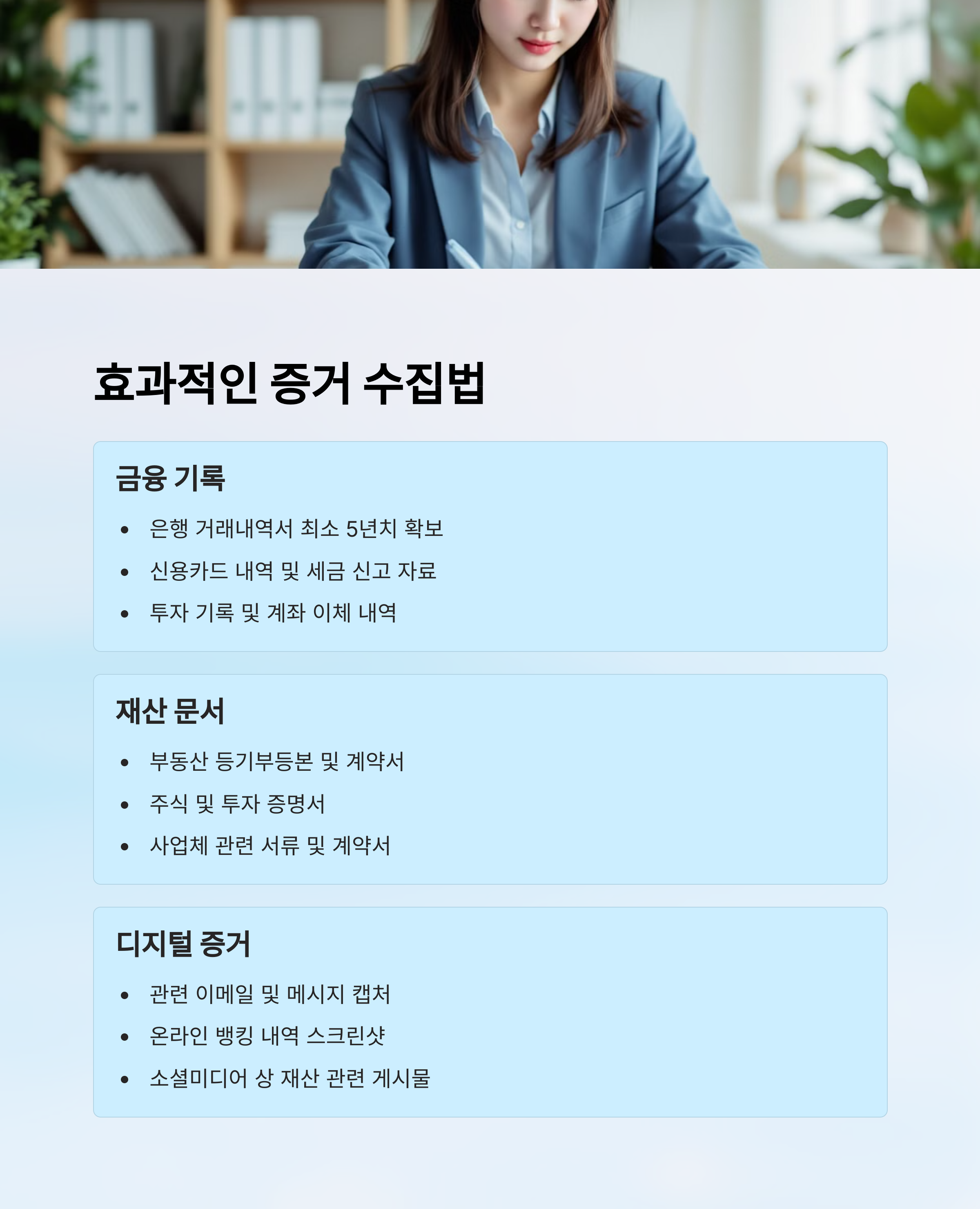 단, 몰래 녹음, 무단 컴퓨터 접근 등은 불법 증거로 채택되지 않거나 오히려 역효과가 날 수 있으니 주의해야 해요.
