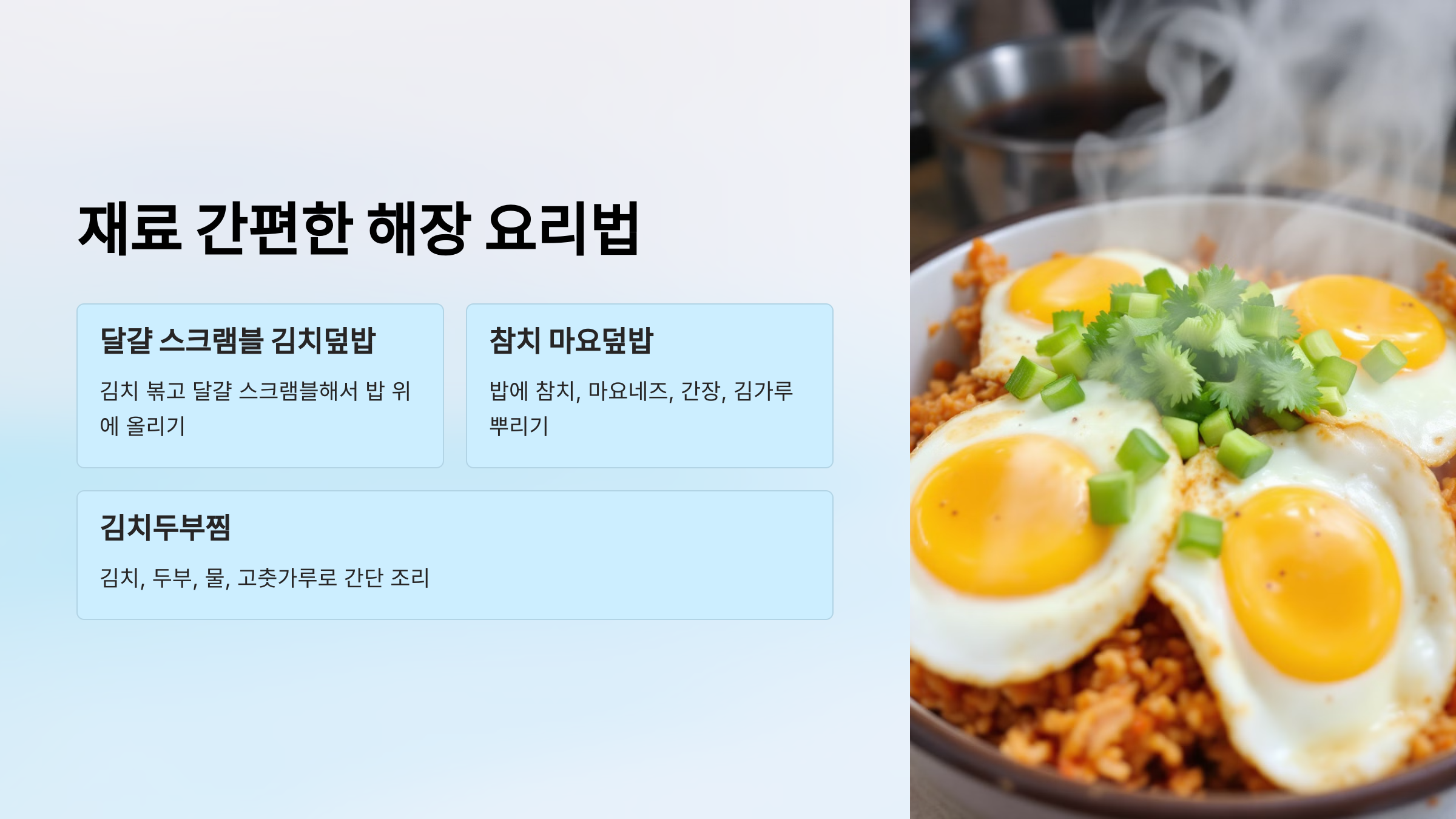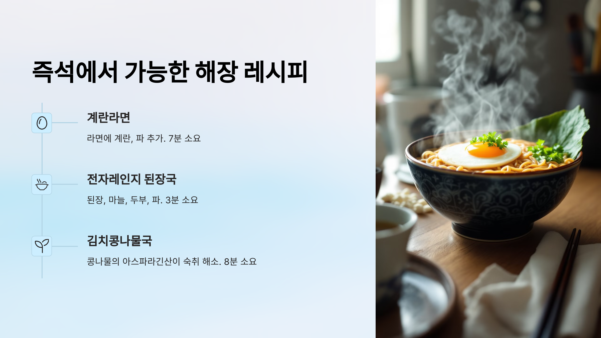 위 세 가지 메뉴는 따로 장 볼 필요 없이 냉장고 속 기본 재료로 충분히 가능해요. 준비 시간도 10분 이내라 숙취 때 가장 적합하죠.