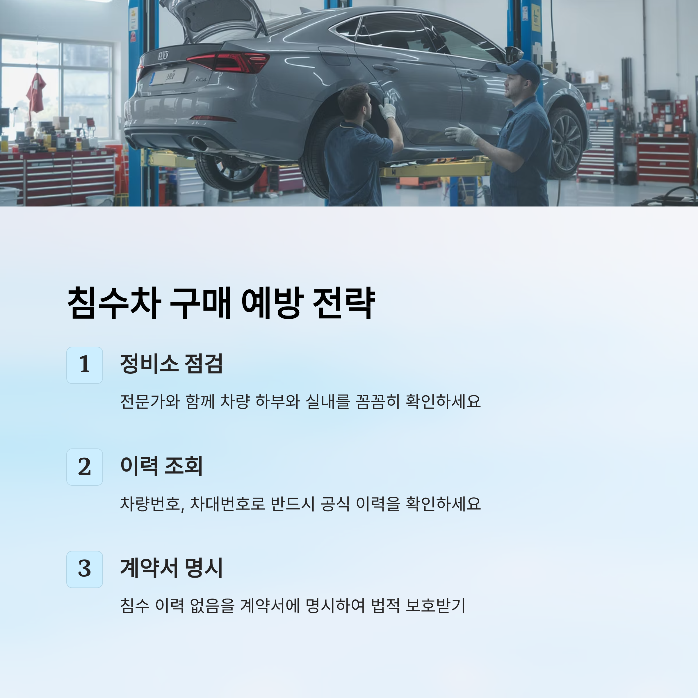 무조건 계약 전에 차량 번호판, 차대번호를 조회해서 이력을 비교하고, 성능점검기록부를 요구하는 습관을 가져야 해요. 차량 매매계약서에도 '침수 이력 없음' 조건을 기재하면 법적으로도 보호받을 수 있어요.