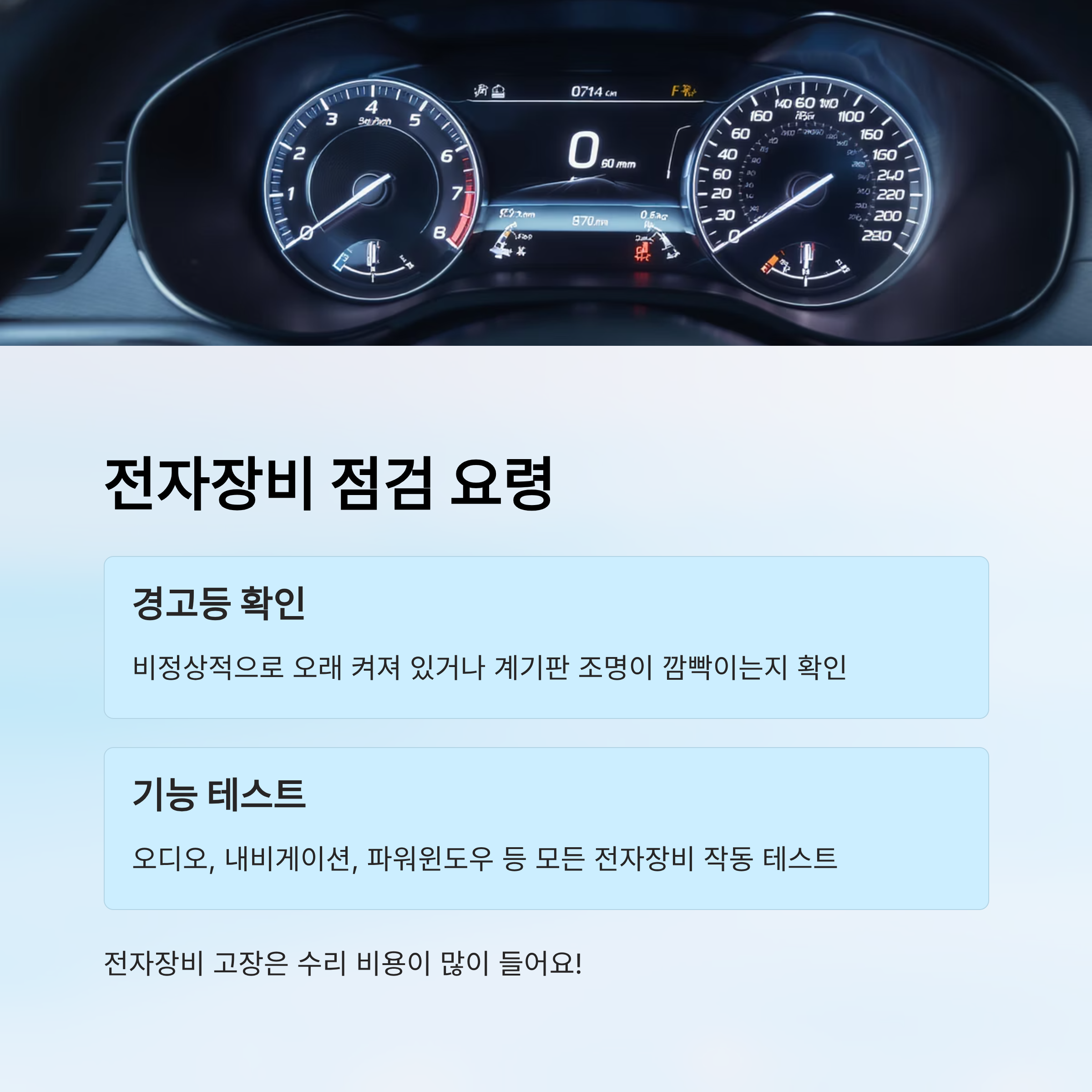 비상등, 방향지시등, 열선 시트, 후방 감지기 등 다양한 기능을 직접 작동해보며 이상 여부를 살펴보세요. 전자장비 고장은 고치기도 어렵고, 비용도 많이 드는 편이에요.