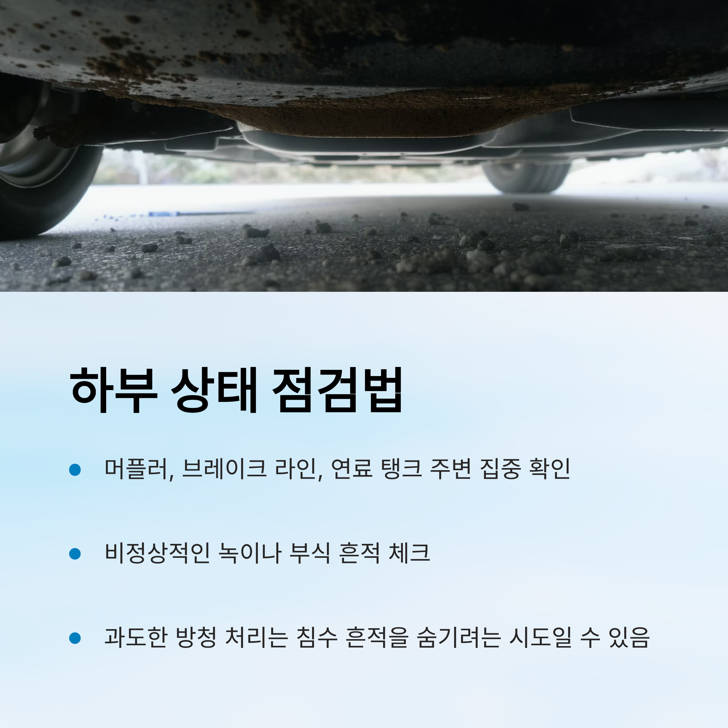 하부에 녹이 슬었거나 부식 흔적이 있는 경우, 일반적인 노후와는 다른 패턴이라면 침수 의심이 가능해요. 차체 용접 부위나 배선 연결 부위에 비정상적인 색 변화, 거뭇한 자국이 있다면 특히 주의해야 해요.