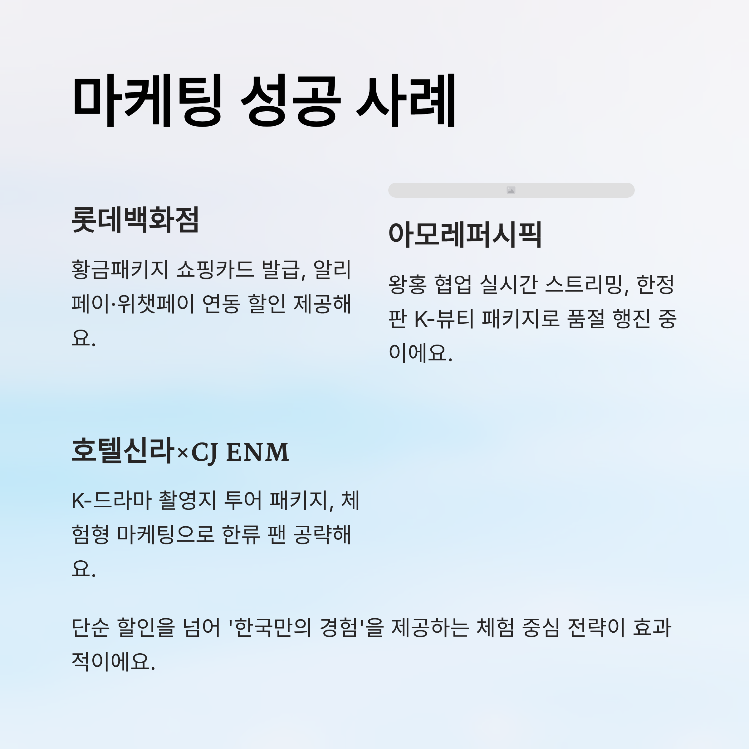 호텔신라와 CJ ENM은 협업 콘텐츠를 제작해 관광과 K콘텐츠를 접목했어요. 단체관광객 전용 K-드라마 촬영지 투어 패키지를 만든 거예요. 투어 중에는 드라마 명대사 따라 하기, 포토존 이벤트, 굿즈 제공 등 체험형 마케팅을 포함해 ‘기념할 만한 한국 여행’ 이미지를 심어주고 있어요. 📸