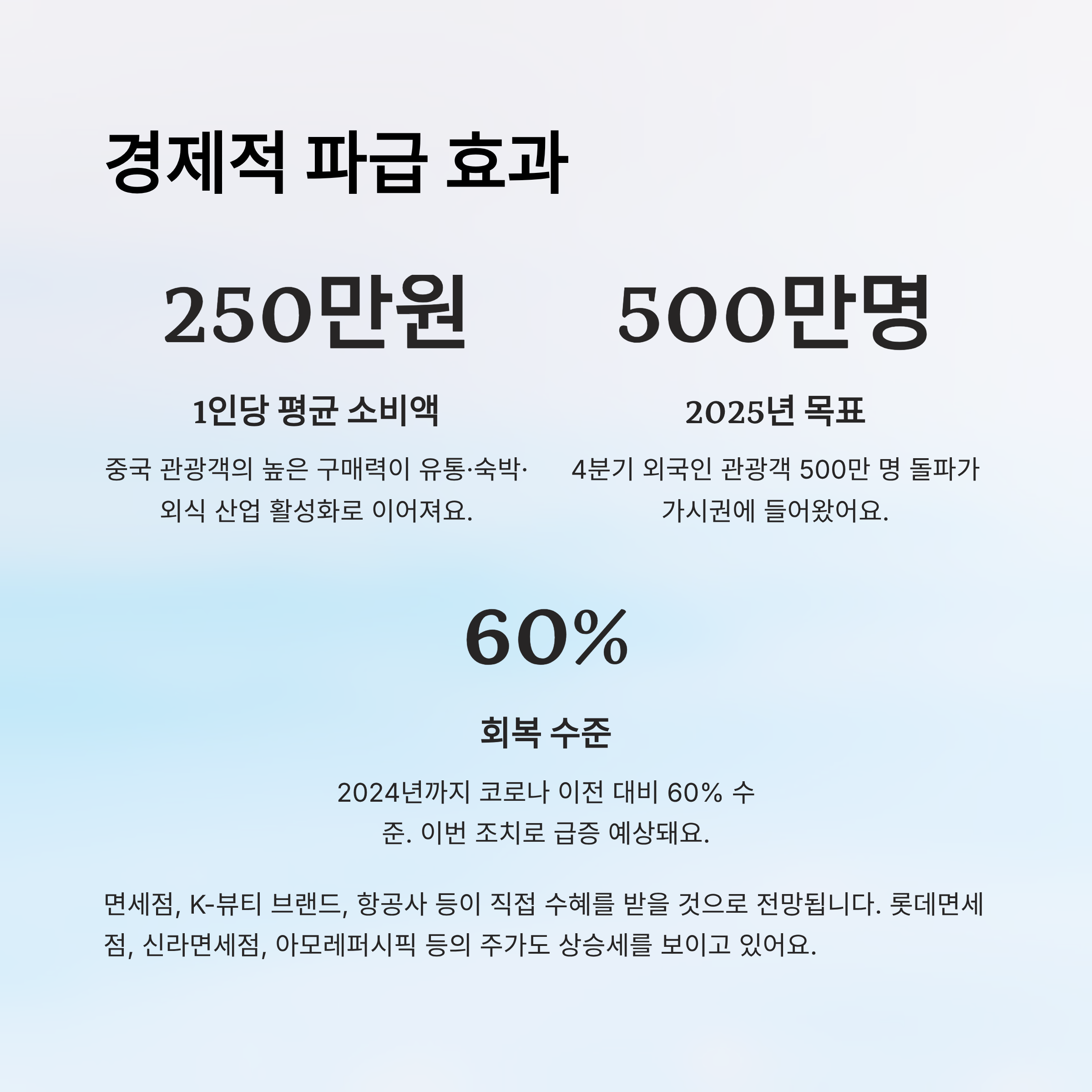 중국인 단체관광객의 무비자 입국 시행은 단순히 관광 분야에만 영향을 주는 게 아니에요. 이 결정은 한국 경제 전반에 걸쳐 실질적인 파급 효과를 낳을 수밖에 없죠. 특히 외국인 관광객 1인당 평균 소비액이 높은 중국 관광객의 귀환은 유통·숙박·교통·외식 등 다양한 산업을 활기차게 만들 가능성이 커요.