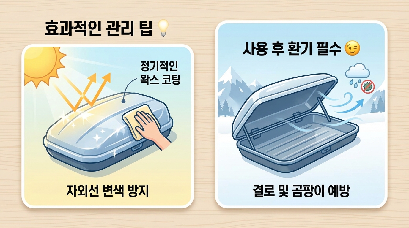루프박스를 오랫동안 깨끗하게 유지하려면 주기적인 왁싱이 필요합니다. 플라스틱 재질이라 자외선에 오래 노출되면 색이 바랠 수 있거든요. 그리고 겨울철에는 내부 결로가 생겨 곰팡이가 필 수 있으니, 캠핑을 다녀온 뒤에는 뚜껑을 열어 하루 정도 환기해 주는 센스! 잊지 마세요. 😉