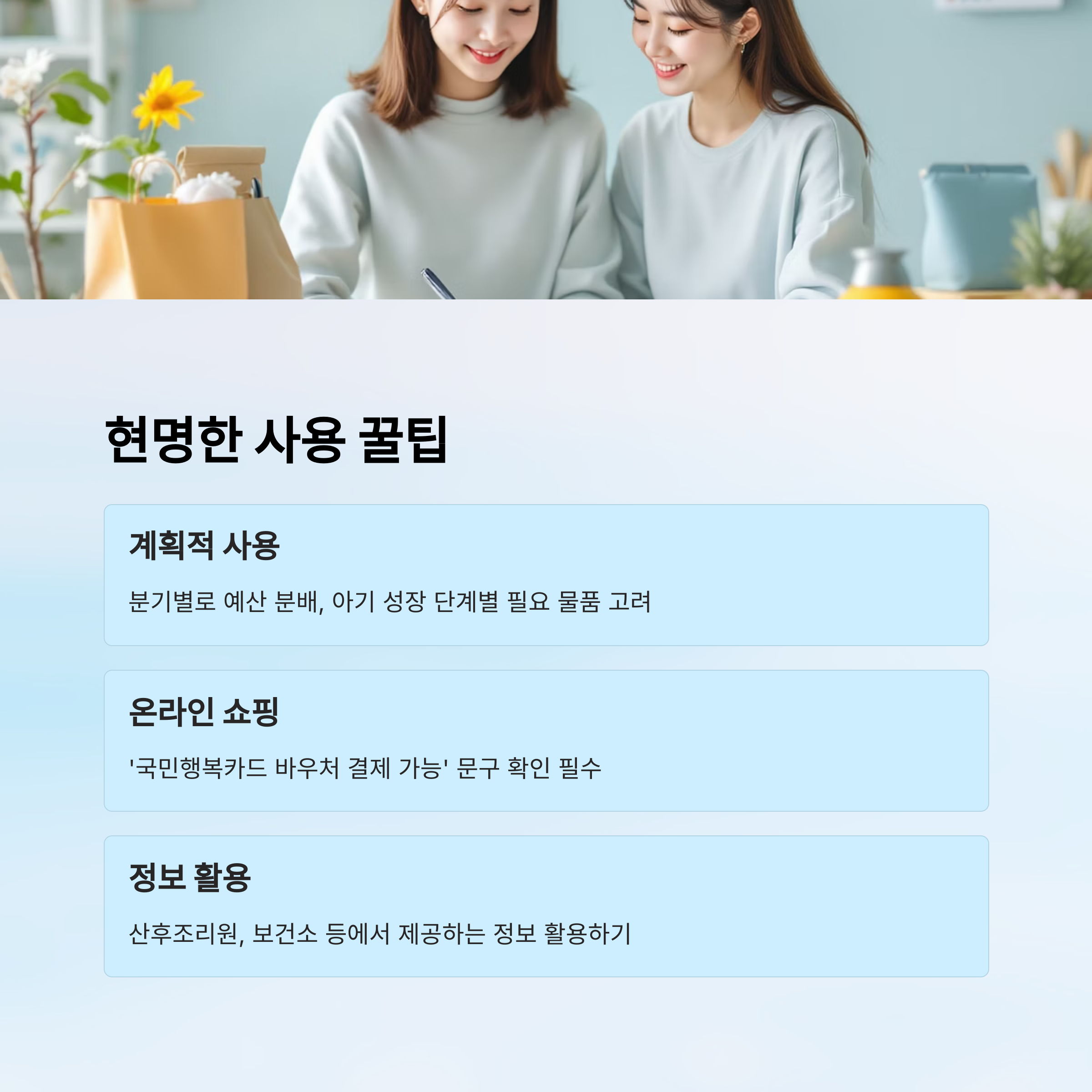 또한 사용 기한이 1년이라는 점을 기억하면서, 초기에 너무 몰아서 사용하기보다는 분기별로 나눠서 예산을 관리하면 더 효과적이에요. 생후 3개월, 6개월, 9개월 시점마다 필요한 물품이 달라지기 때문에 이를 고려한 소비 계획이 필요하답니다.