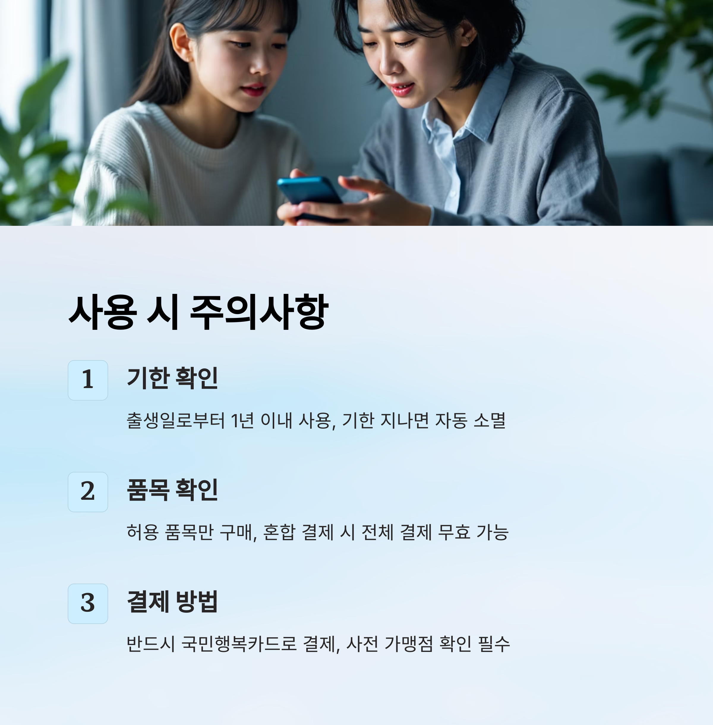 내가 생각했을 때 이 제도는 단순한 지원금을 넘어, 육아에 대한 사회적 책임 분담의 시작이라고 느껴졌어요. 단, 아무 데서나 사용할 수는 없기 때문에 정확한 제한 업종 확인은 필수예요!