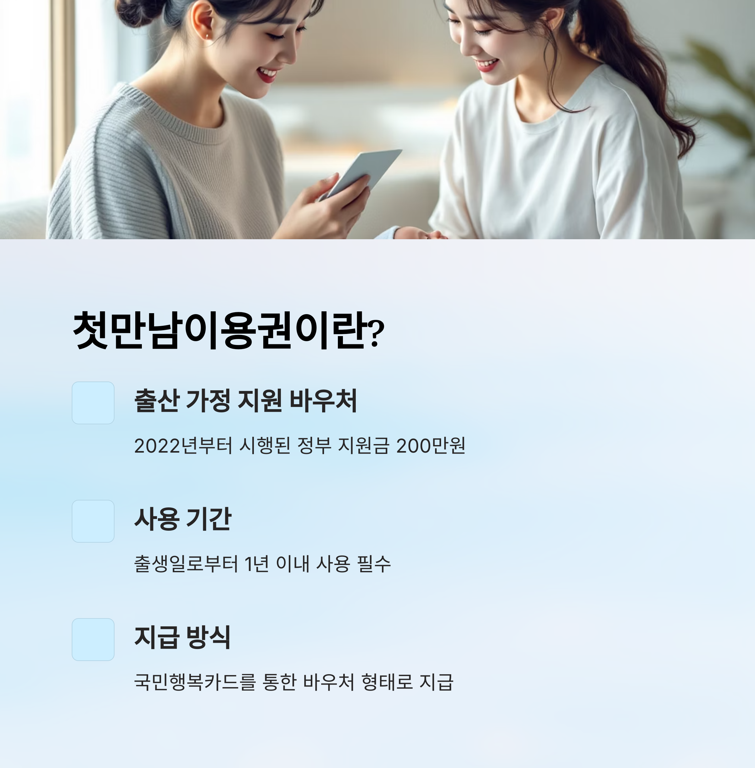 첫만남이용권은 2022년부터 시행된 정부 바우처 제도로, 아기가 태어난 가정에 일정 금액을 지원해주는 제도예요. 처음에는 200만원의 바우처가 제공됐고, 사용기간은 출생일로부터 약 1년까지로 제한돼 있어요. 국민행복카드를 통해 바우처 형태로 지급되며, 전용 앱이나 카드사 홈페이지에서도 잔액 확인과 사용처 조회가 가능해요.