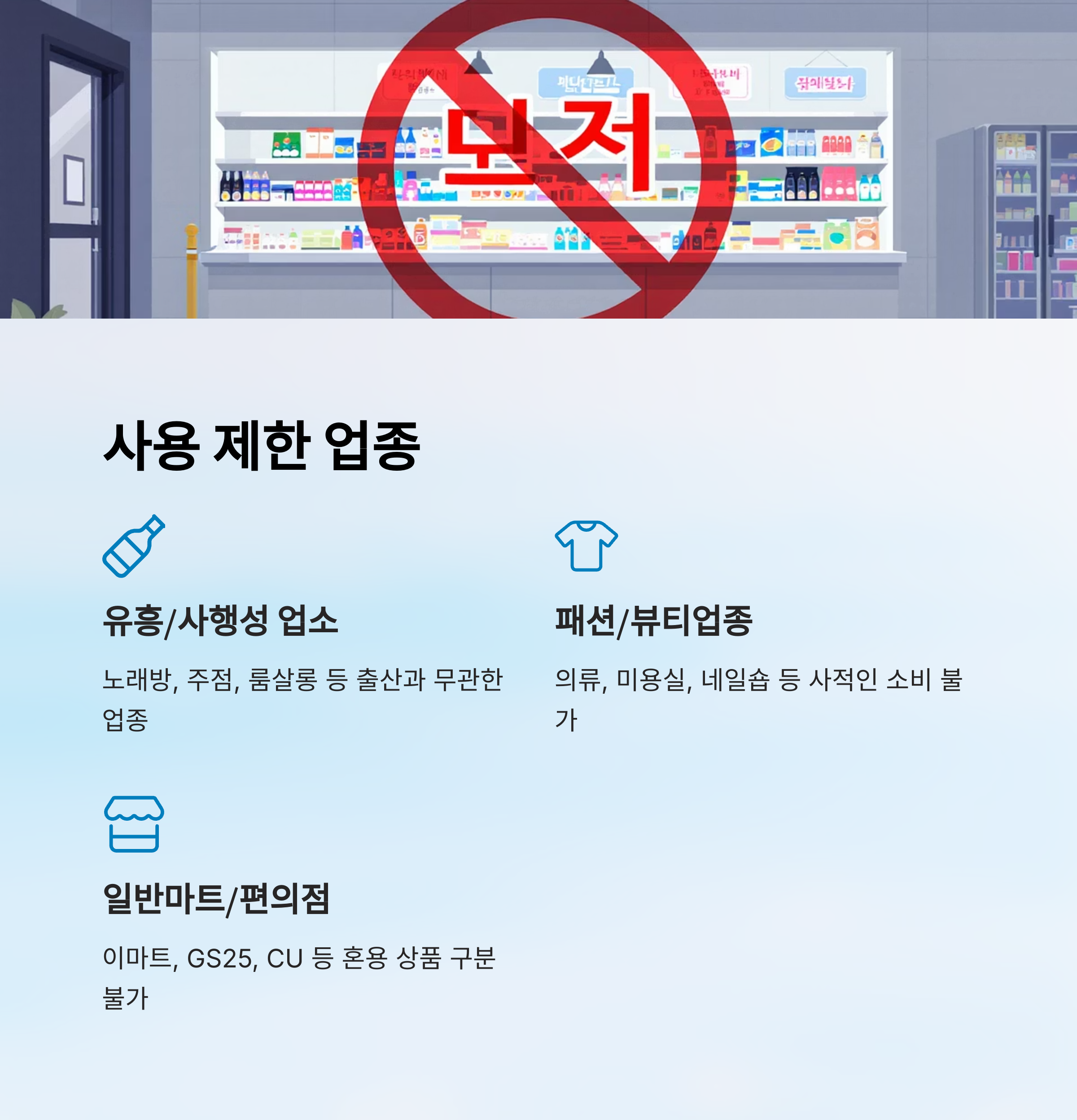 대표적으로 금지된 업종에는 주점, 유흥업소, 피부미용실, 네일숍, 헬스장, 마사지숍, 숙박업, 의류 및 패션잡화점, 편의점, 일반 대형마트 등이 있어요. 심지어 같은 장소라도 업종 등록 코드에 따라 차이가 날 수 있기 때문에, 사전 확인이 필수랍니다.