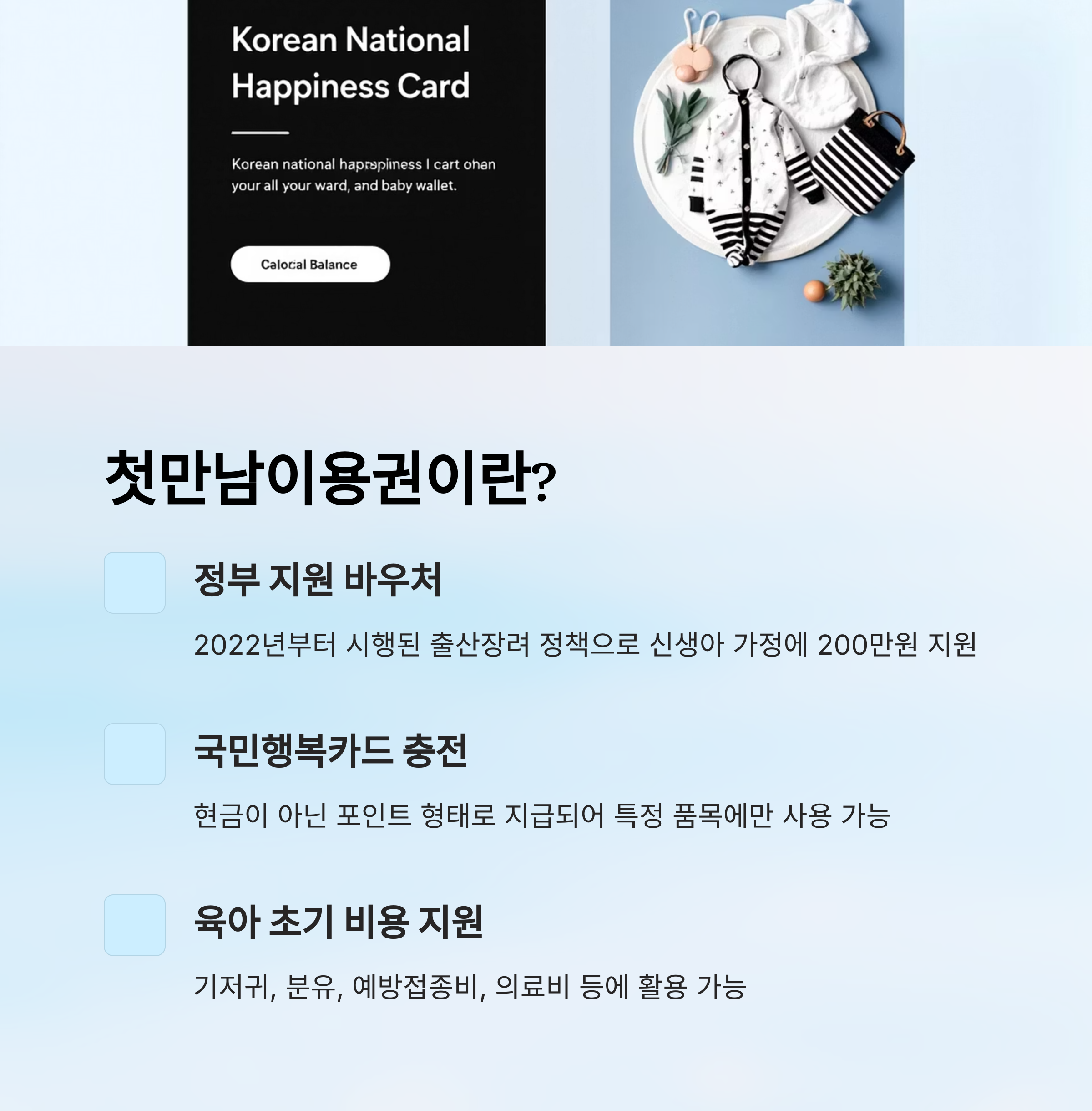 첫만남이용권은 정부에서 신생아 가정에 제공하는 출산지원금 형태의 바우처예요. 보건복지부가 주관하고, 지자체와 협력하여 제공되며 2022년부터 본격 시행되었죠. 한 아이당 200만 원의 포인트 형태로 지급되고, 국민행복카드에 충전돼요.