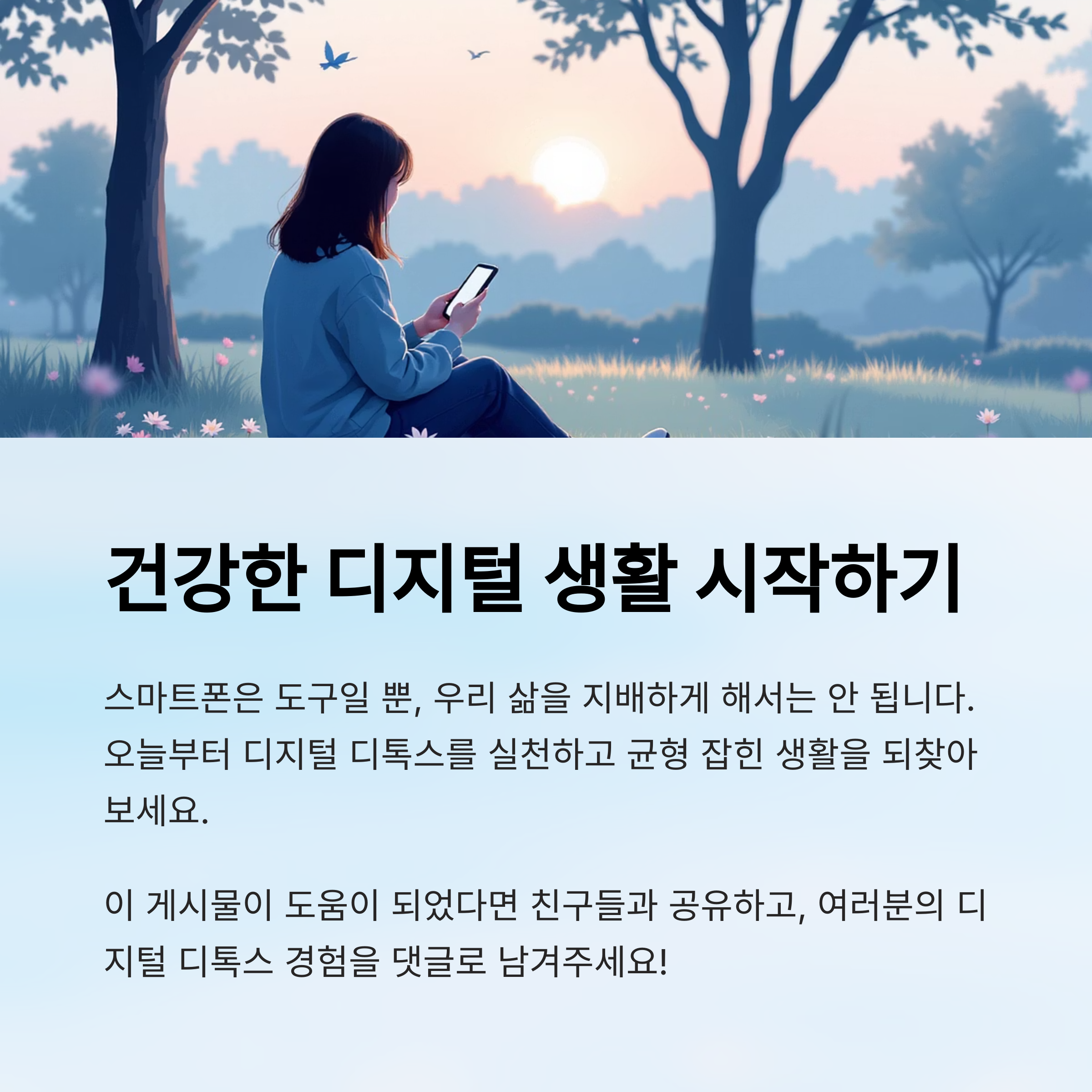 디지털 디톡스를 실천한다고 해서 당장 큰 변화가 나타나진 않아요. 하지만 꾸준히 이어가다 보면 집중력도 좋아지고, 스스로의 시간에 주인이 되는 기분이 들게 될 거예요. 가장 중요한 건 무리하지 않고 나에게 맞는 속도로 실천하는 거예요 💪