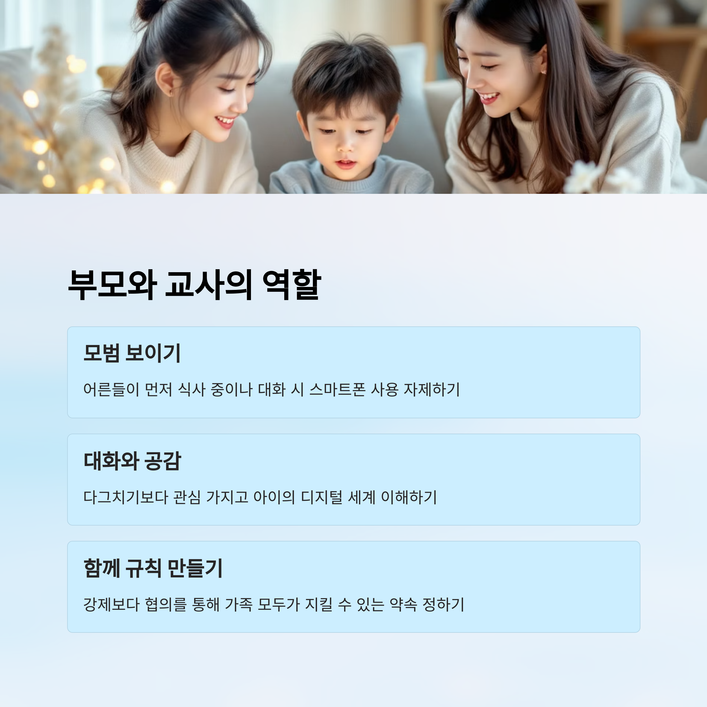 | 부모 | 식사 중 스마트폰 금지 | 가족 간 대화 증가 |