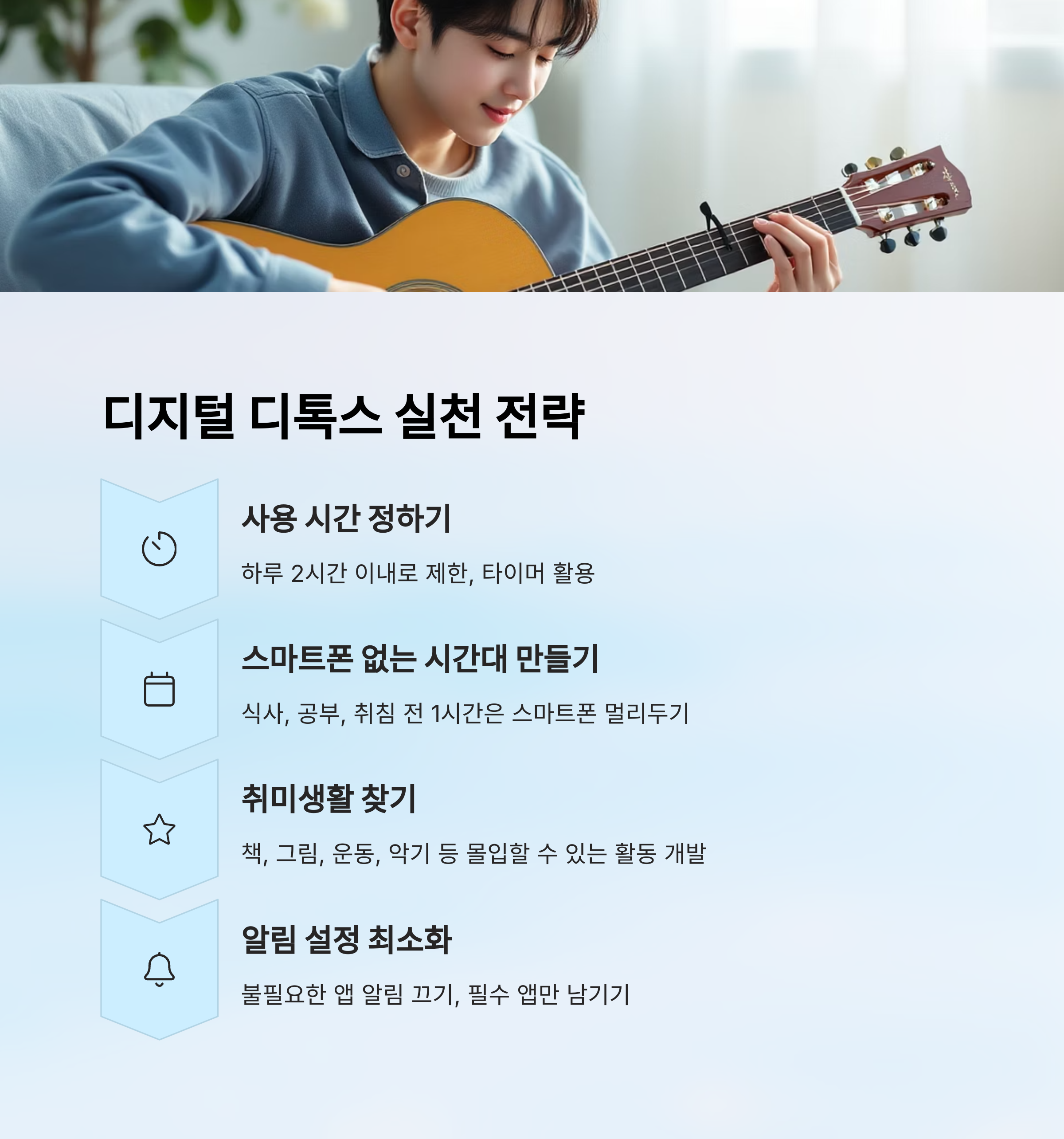 A8. 학습이나 소통처럼 필요한 상황에서는 사용하되, 시간 제한과 목적을 명확히 하는 게 중요해요. 필요한 만큼만 사용하고, 다시 내려놓는 습관을 들여야 해요.