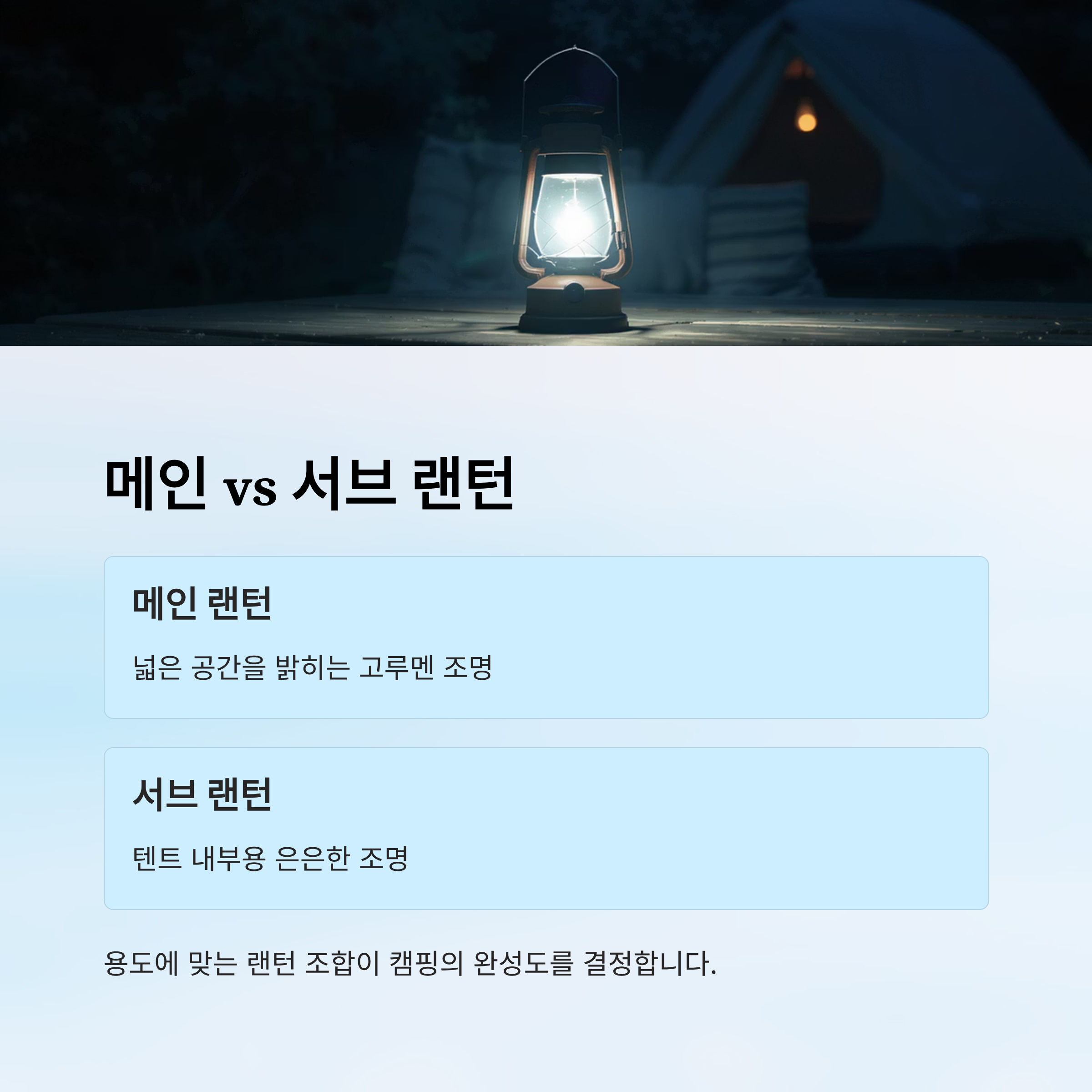 캠핑 랜턴은 크게 '메인 랜턴'과 '보조 랜턴'으로 나눌 수 있어요.