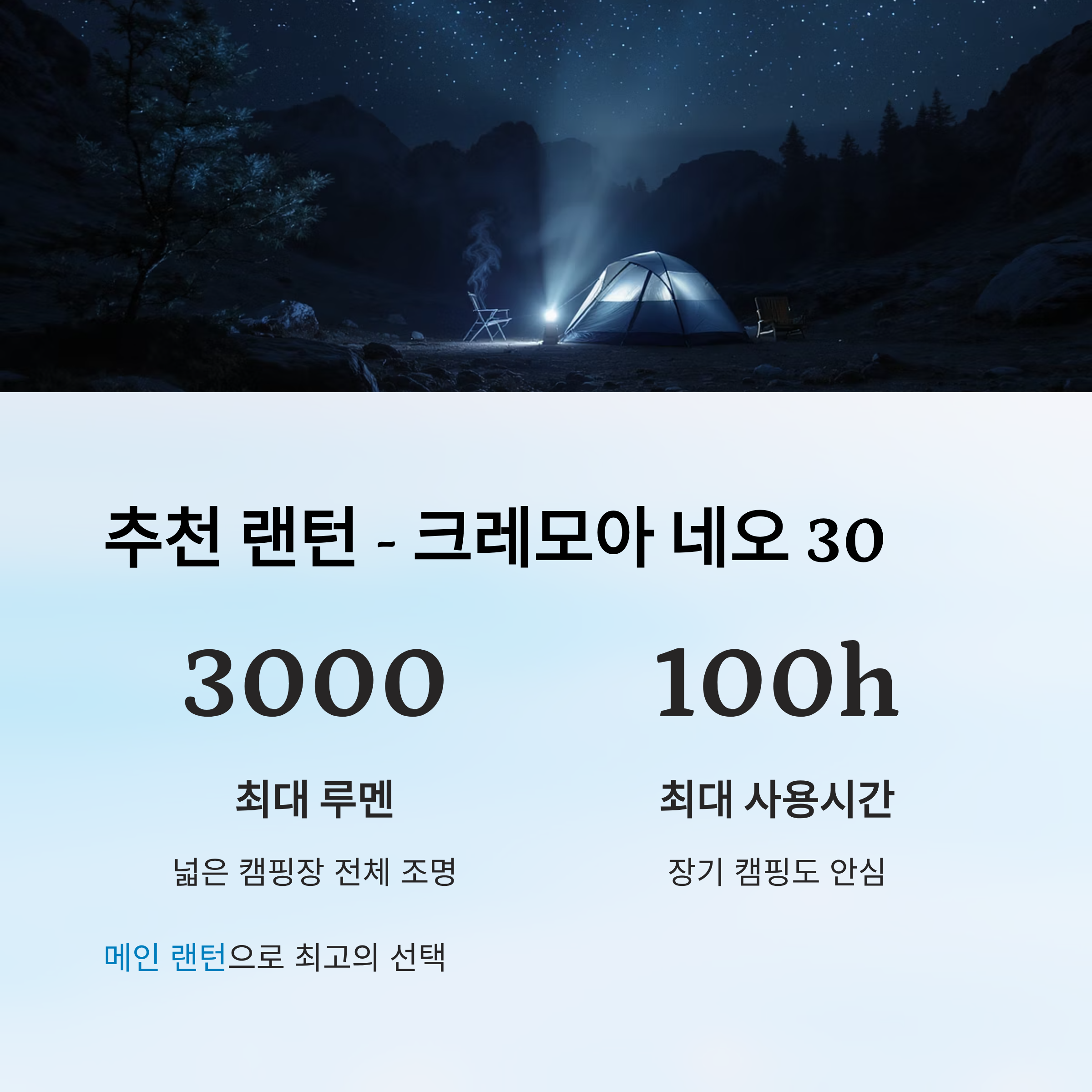 메인 조명은 밤의 캠핑장 분위기를 좌우합니다.