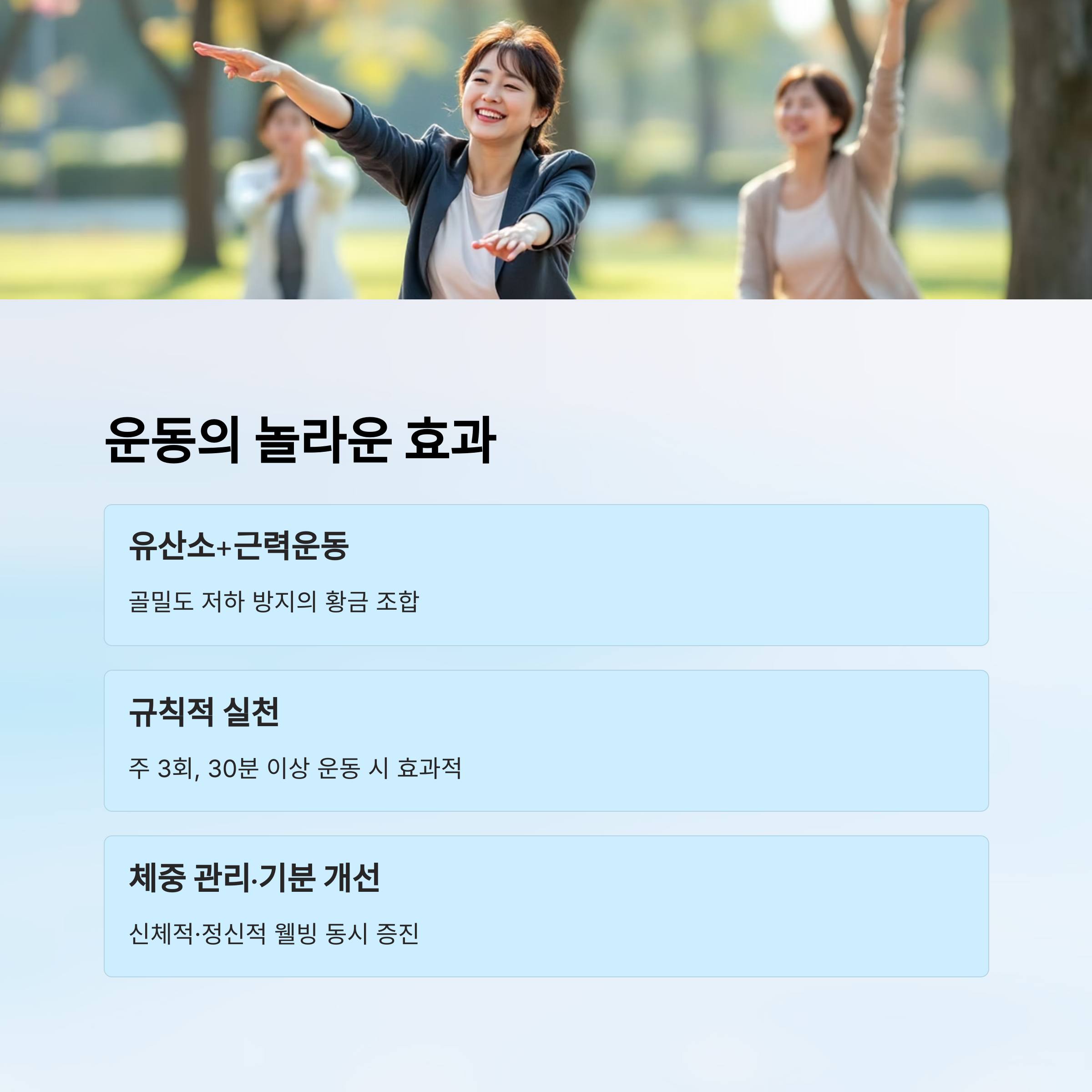 | 근력운동 | 20~30분 | 근육 보강, 골다공증 예방 | 주 2~3회 |