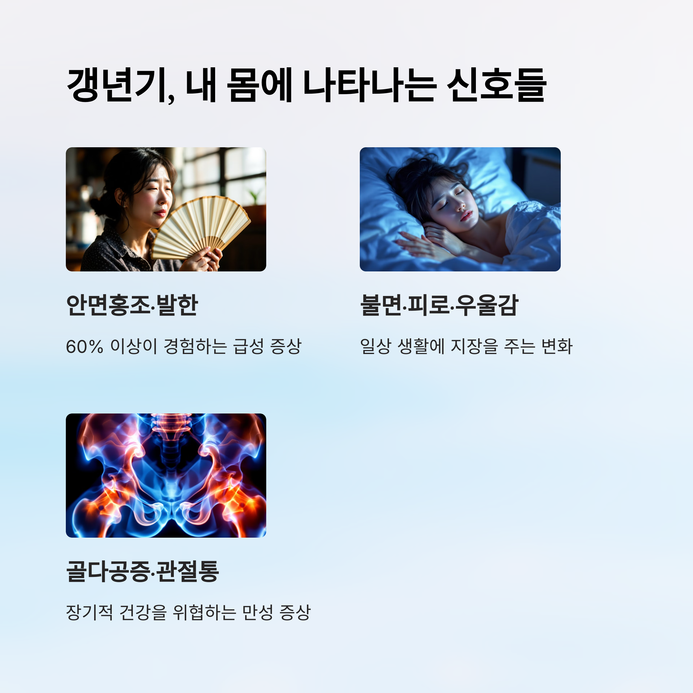 갱년기 동안 겪게 되는 증상은 개인차가 정말 커요. 어떤 분은 거의 증상이 없지만, 또 어떤 분은 일상생활이 힘들 만큼 불편함을 겪기도 하죠.