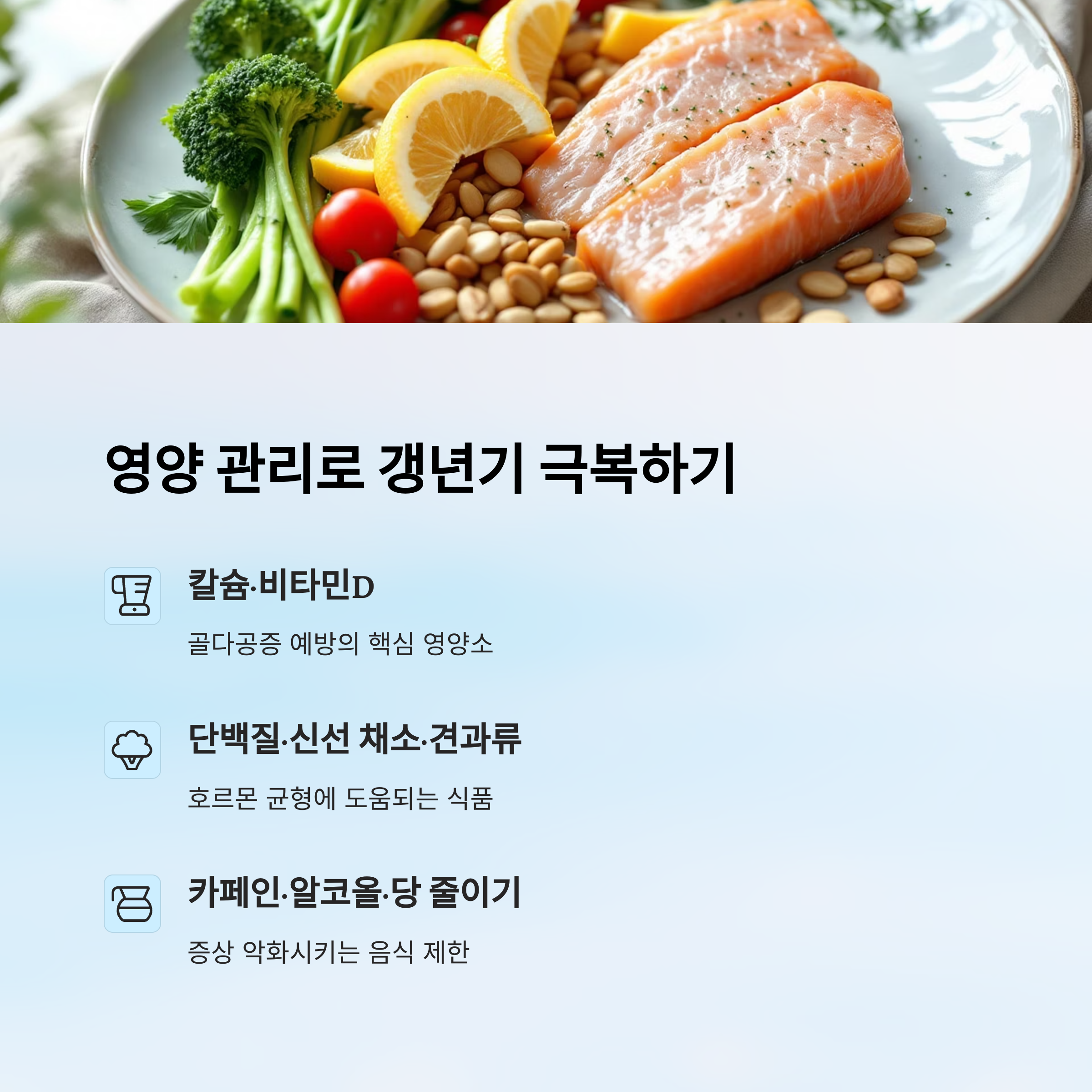 이 시기에는 칼슘, 비타민 D, 단백질, 오메가3 같은 영양소가 특히 중요해요. 뼈 건강과 심혈관 건강을 함께 챙길 수 있죠.