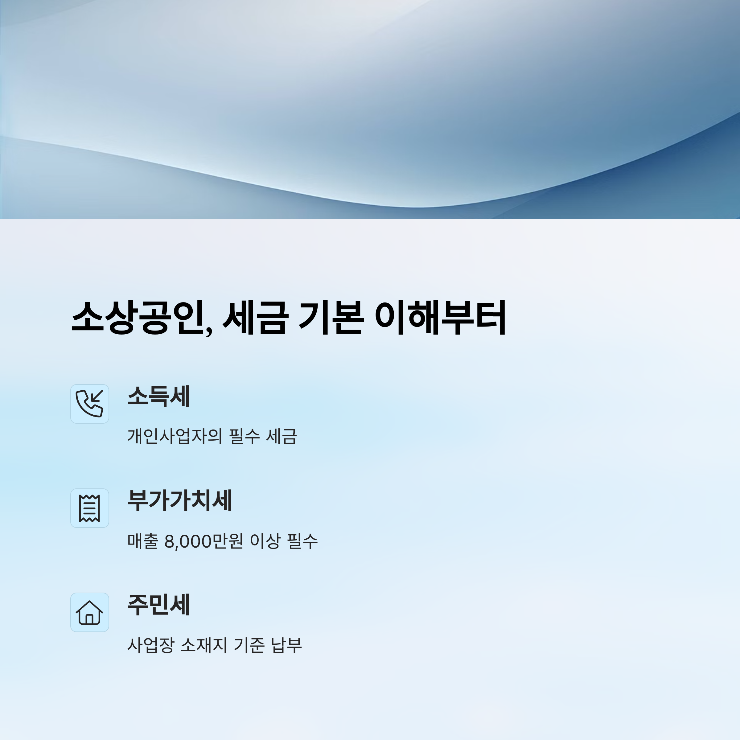 소상공인이 가장 먼저 알아야 할 건 '어떤 세금을 내야 하는지'예요. 세금은 크게 **소득세, 부가가치세, 4대 보험료, 주민세**로 나눌 수 있어요.