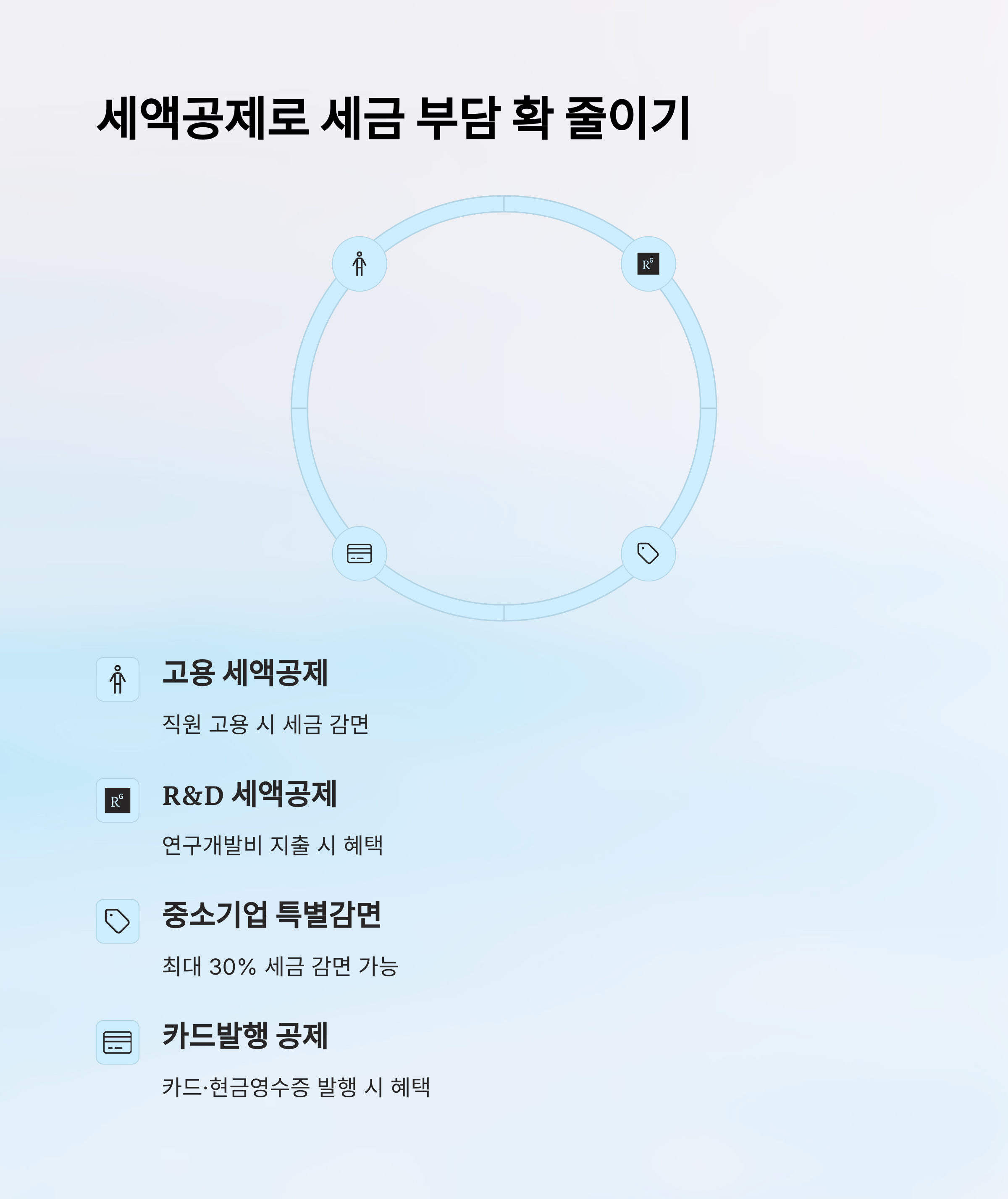 | 고용창출 세액공제 | 직원 고용 증가 시 공제 | 1인당 최대 수백만 원 |