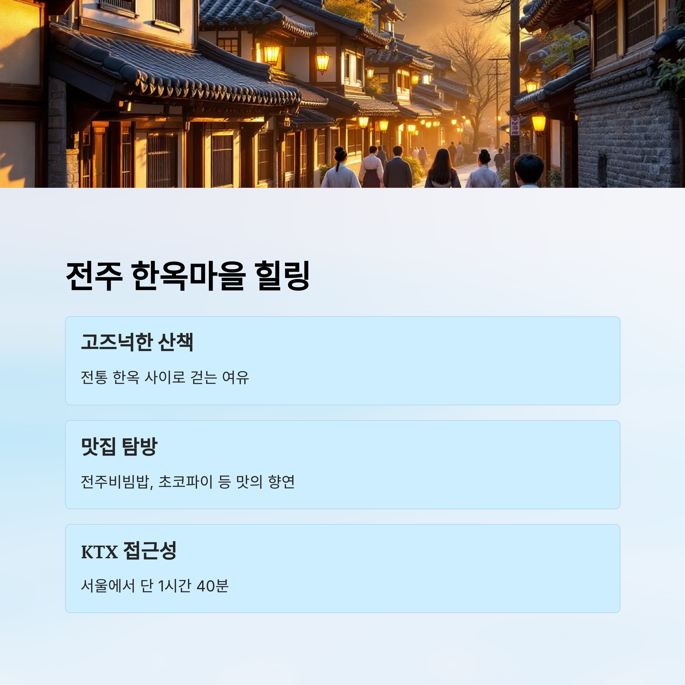 전주는 서울에서 KTX로 약 1시간 30분이면 도착할 수 있어요. 조용하고 고즈넉한 한옥 분위기를 좋아한다면 전주는 정말 딱이에요. 🏯