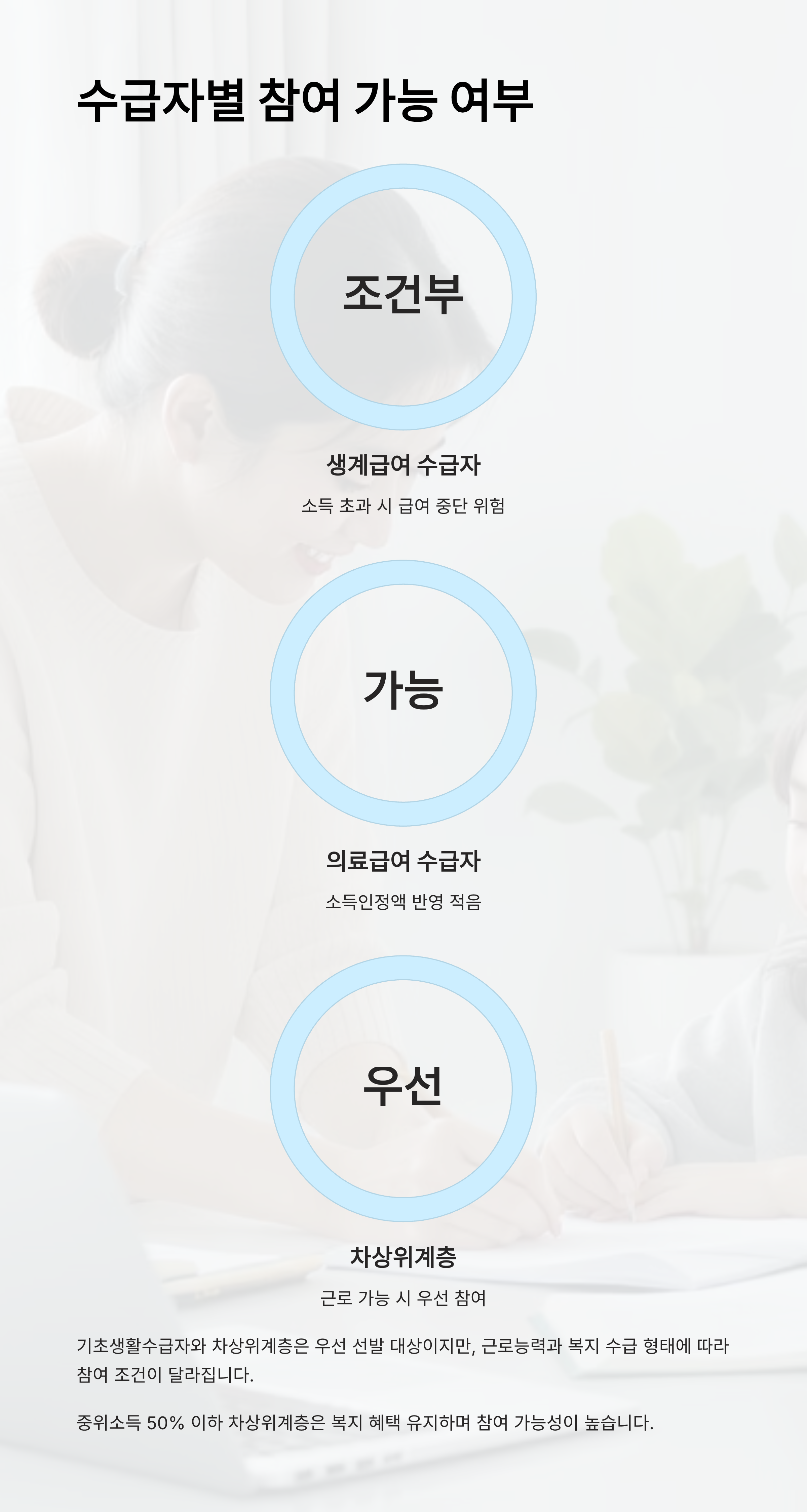 기초생활수급자나 차상위계층은 우선 대상이 되지만, 근로소득이 기존 복지급여에 영향을 줄 수 있기 때문에 반드시 사전 상담이 필요하답니다. 특히 생계급여 수급자의 경우에는 급여 중지 위험도 존재해요.