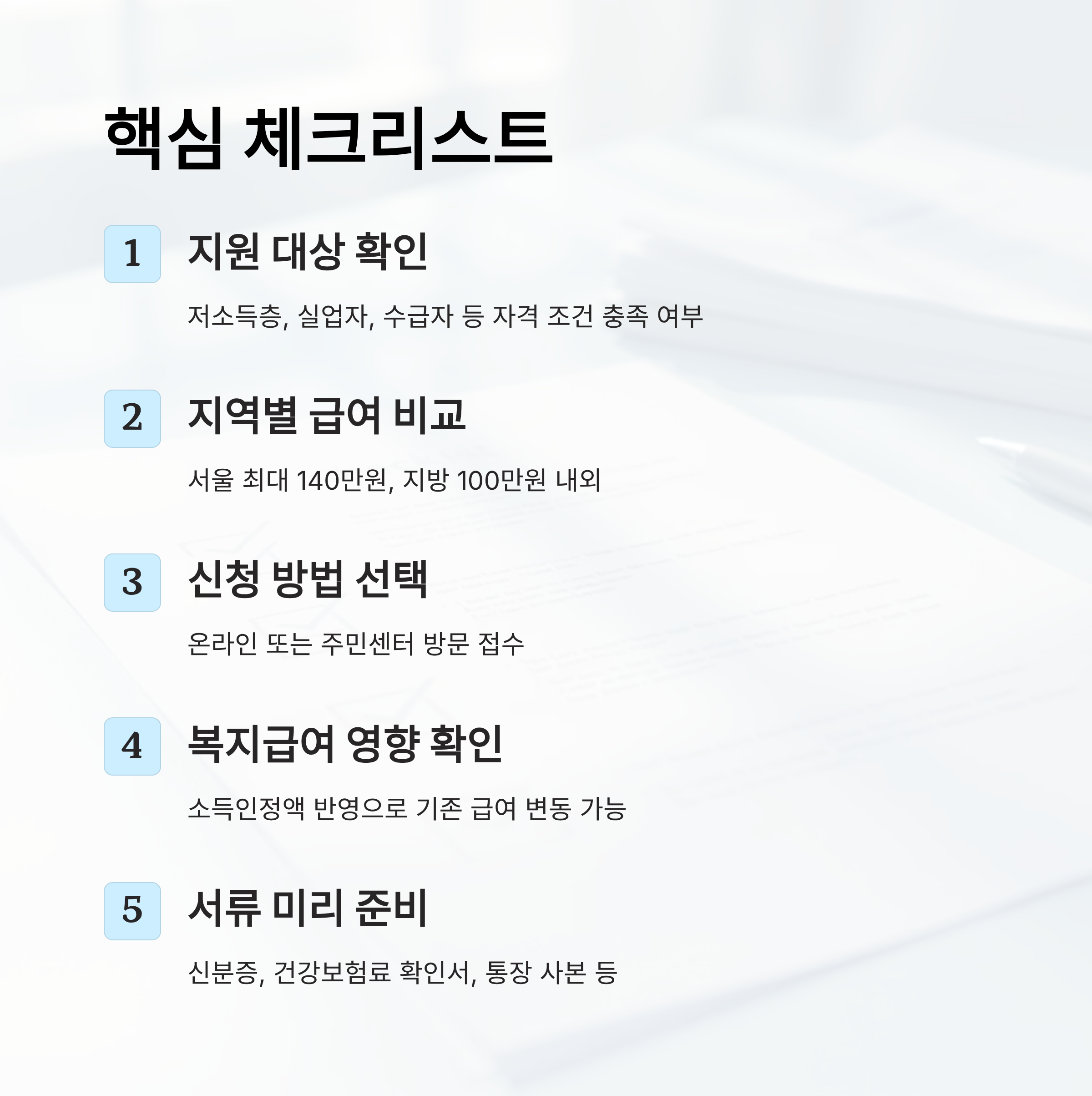 방문 신청은 주소지 관할 주민센터(동사무소)나 구청 고용복지과에서 가능해요. 서류를 미리 준비해 가면 접수 속도가 빨라지고, 누락도 방지할 수 있답니다. 보통 신분증, 건강보험료 납부확인서, 가족관계증명서, 통장 사본 등이 필요해요.