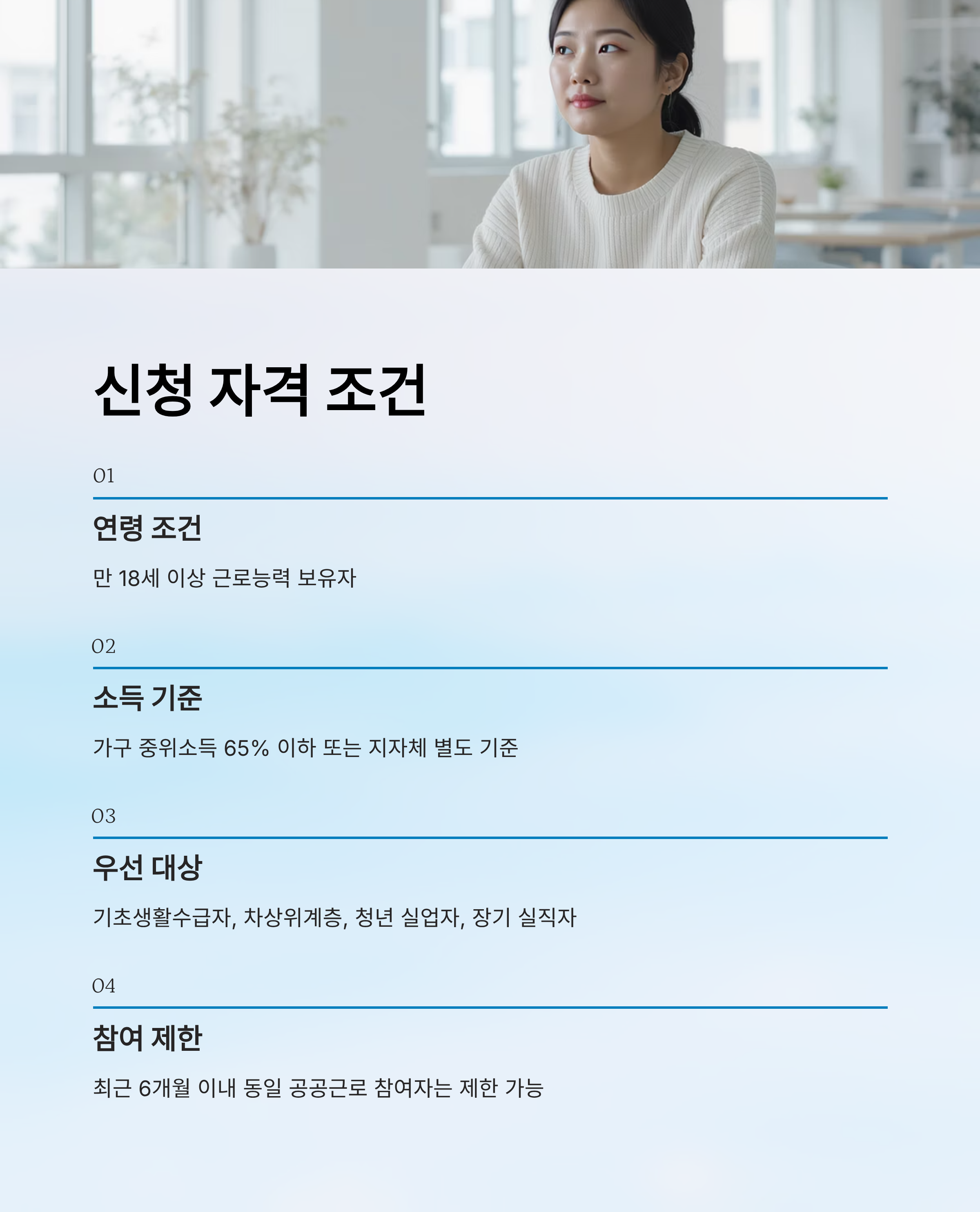 또한 최근 6개월 이내 동일한 공공근로에 참여한 경험이 있는 경우엔 재참여가 제한될 수 있어요. 단, 사업 종류에 따라 일부 허용되기도 해요. 동일 세대 내에서는 1인만 참여 가능한 경우도 있고요.