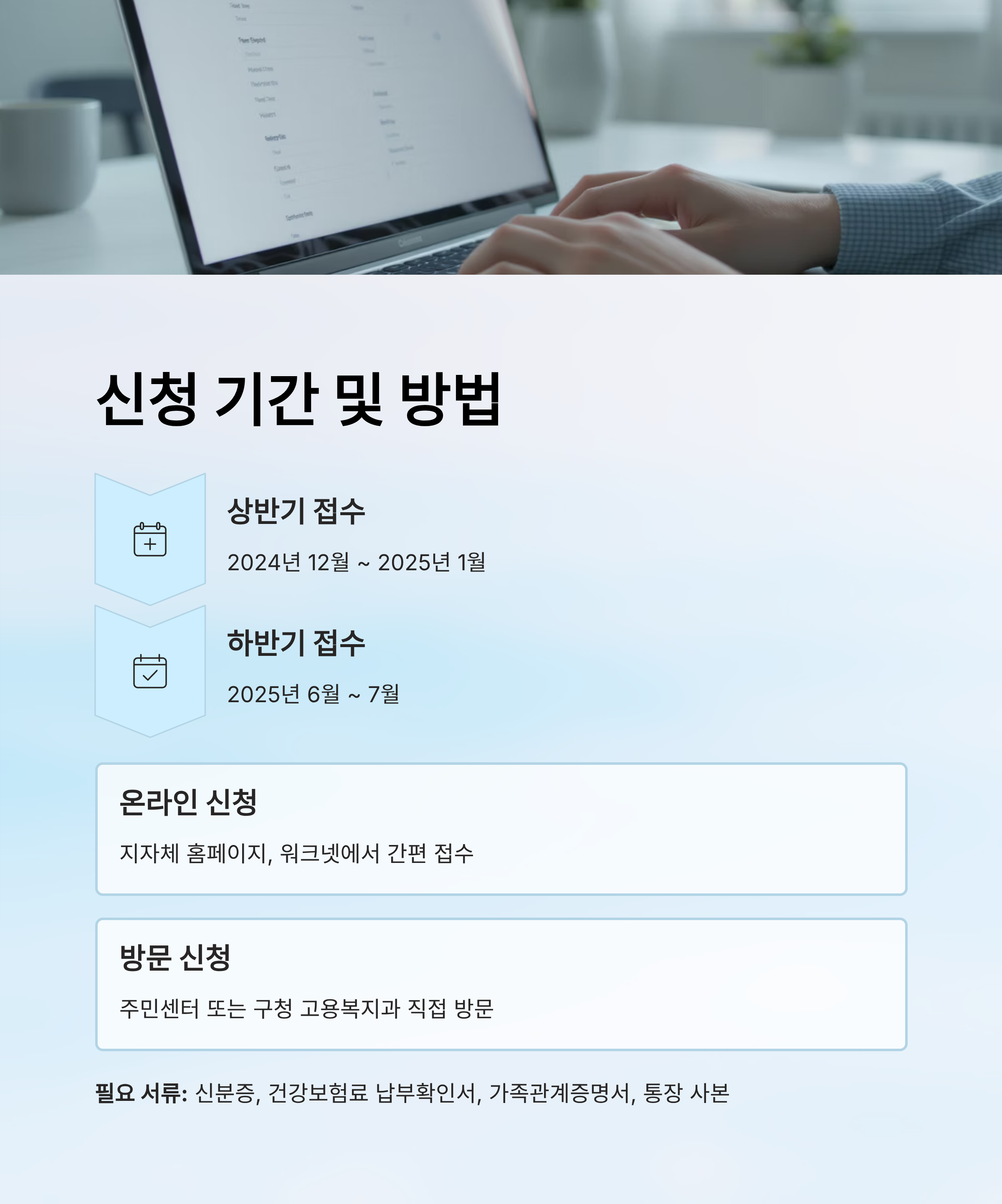 신청은 상반기(12월~1월), 하반기(6~7월)로 구분되며, 온라인 또는 주소지 주민센터를 통해 접수할 수 있어요. 단, 제출 서류와 신청 조건을 철저하게 갖추는 것이 중요하답니다.