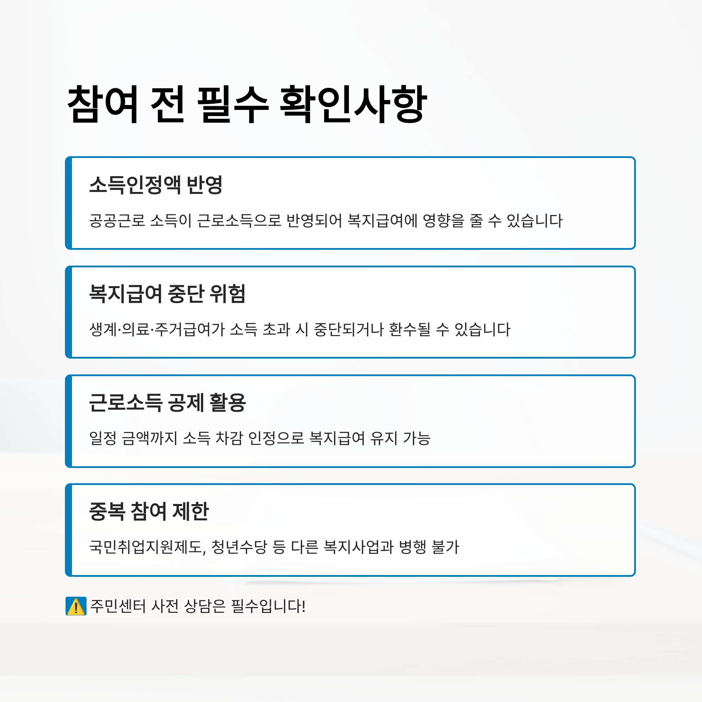 단, 소득신고를 누락하거나 변동 사실을 고지하지 않으면 복지 급여가 추징될 수 있으니, 참여 전 주민센터 또는 복지전담 공무원과 상담 후 신청하는 게 안전해요.