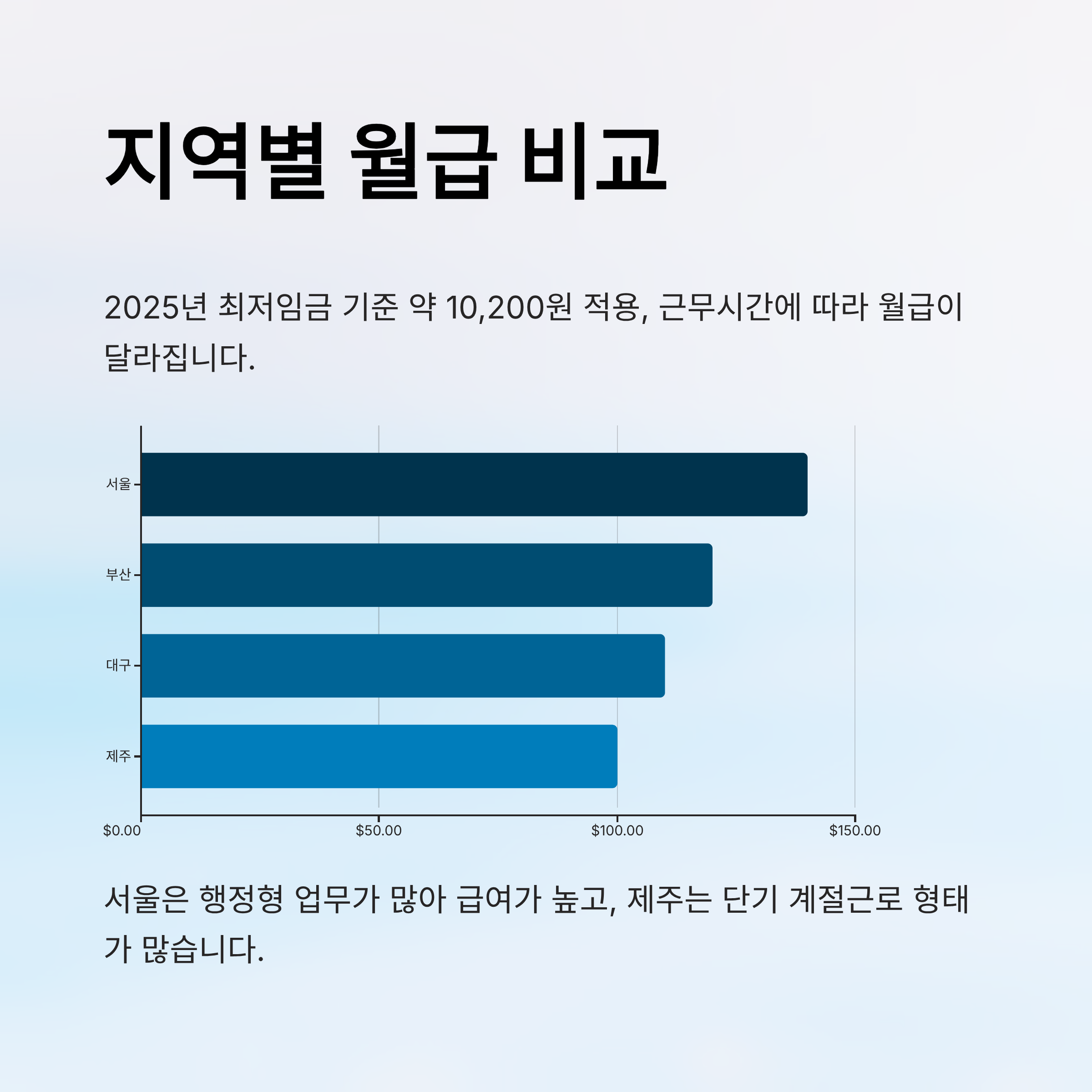 서울은 월 최대 140만원 이상, 부산은 120만원대, 대구는 110만 원, 제주는 계절근로 형태로 100만 원 전후까지 지원되는 경우가 있어요. 내가 생각했을 때 제주는 단기형 공공근로가 많고, 서울은 행정형이 많아서 금액 차이가 나는 것 같아요.