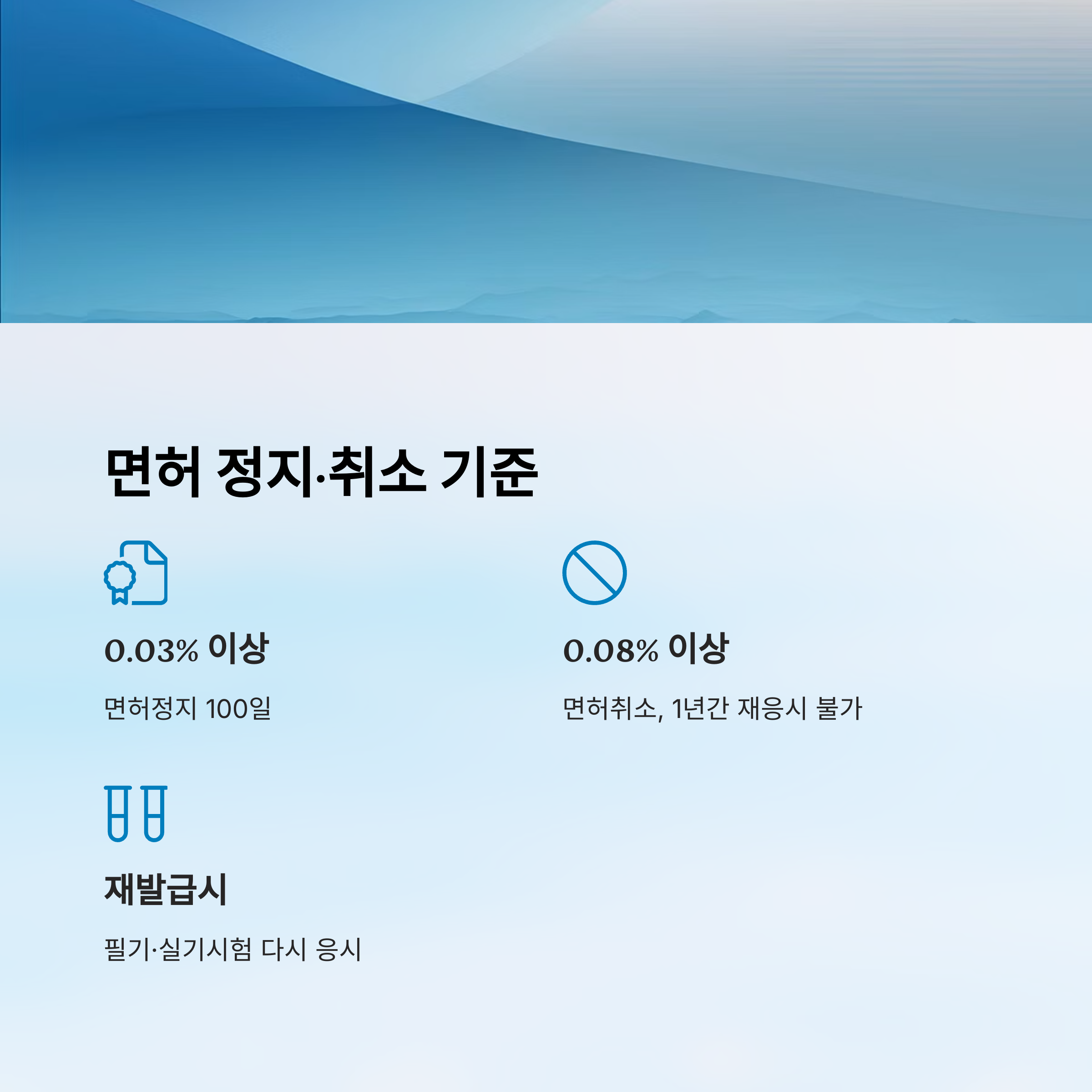 혈중알코올농도 0.03% 이상 0.08% 미만이면 면허 정지 100일, 0.08% 이상이면 바로 면허 취소예요. 취소 후 1년 동안은 재응시도 불가능하고, 재발급을 받기 위해선 다시 필기·실기시험을 봐야 해요.