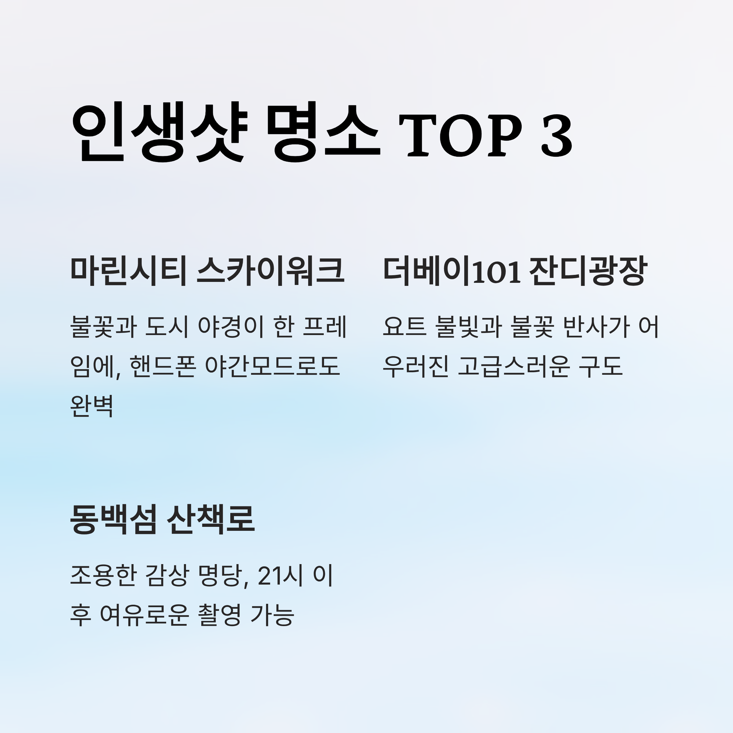 | 해운대 마린시티 | 불꽃+야경 조합 명소 | 20:00~21:00 |