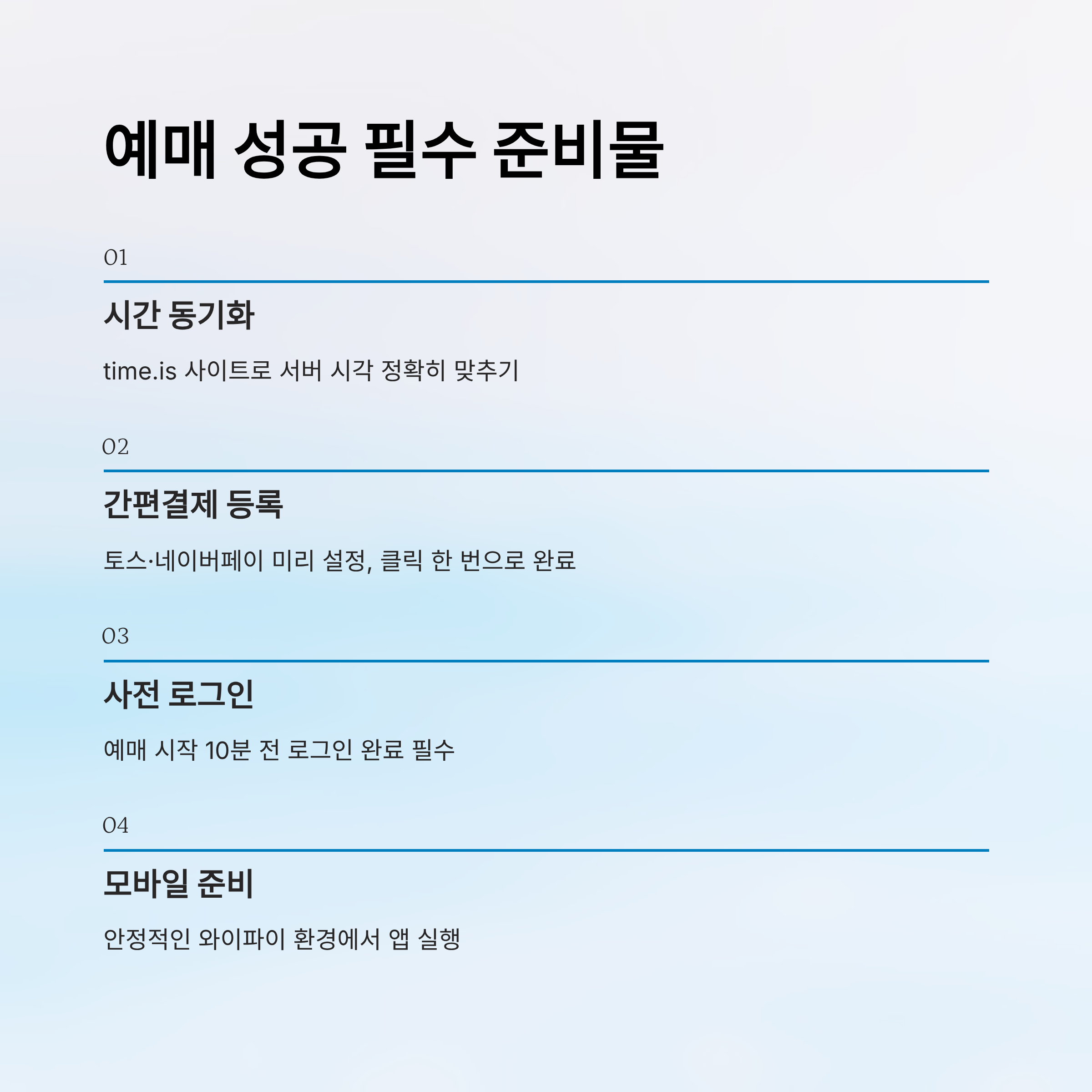 예매 성공의 핵심은 ‘타이밍’이에요. 서버 시간이 정확하지 않으면 예매창이 열려도 클릭이 늦어져요. 반드시 ‘네이버 시간 동기화’나 ‘time.is’ 사이트를 활용해 서버와 같은 초단위 시각으로 맞추세요. 또 하나, ‘카드 결제’보다 ‘간편결제(토스, 네이버페이)’가 훨씬 빨라요. 미리 등록해두면 클릭 한 번으로 결제 완료되니까요.