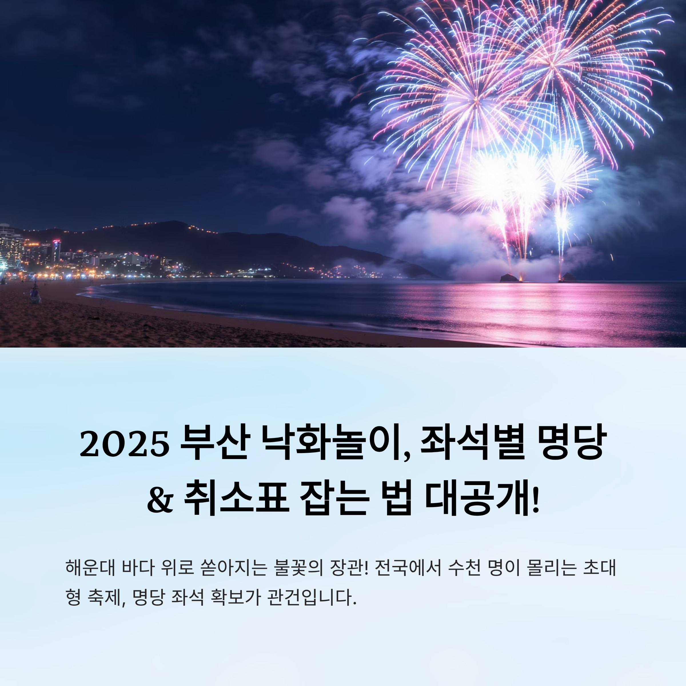 2025 부산 낙화놀이는 단순한 불꽃놀이가 아니라 전국에서 수많은 관람객이 몰려드는 초대형 축제예요. 해운대 바다 위로 쏟아지는 불꽃의 장관을 가까이서 보고 싶다면 ‘명당 좌석’을 미리 확보해야 해요. 특히 올해는 좌석 예매 경쟁이 치열할 것으로 예상되기 때문에, 예매 타이밍과 취소표 공략이 관건이에요!