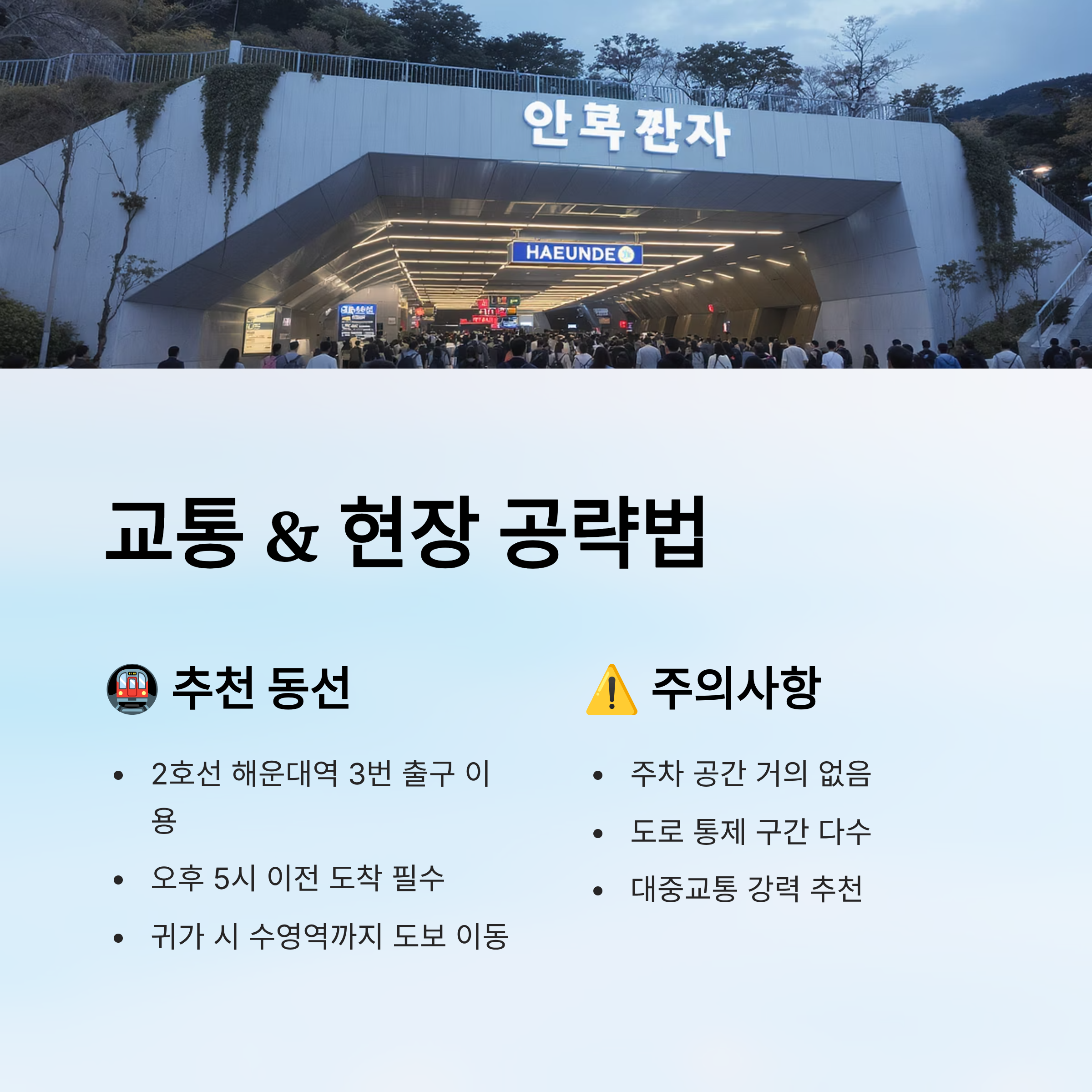 낙화놀이 현장은 해운대 해변을 중심으로, 광안리·수영 쪽까지 인파가 몰려요. 행사 당일에는 도로 통제가 잦고 주차 공간이 거의 없어요. 대중교통을 이용하는 게 가장 현명해요. 특히 2호선 해운대역 3번 출구는 행사장과 가장 가까워요. 오후 5시 이전에 도착해야 입장 대기 줄을 피할 수 있어요.