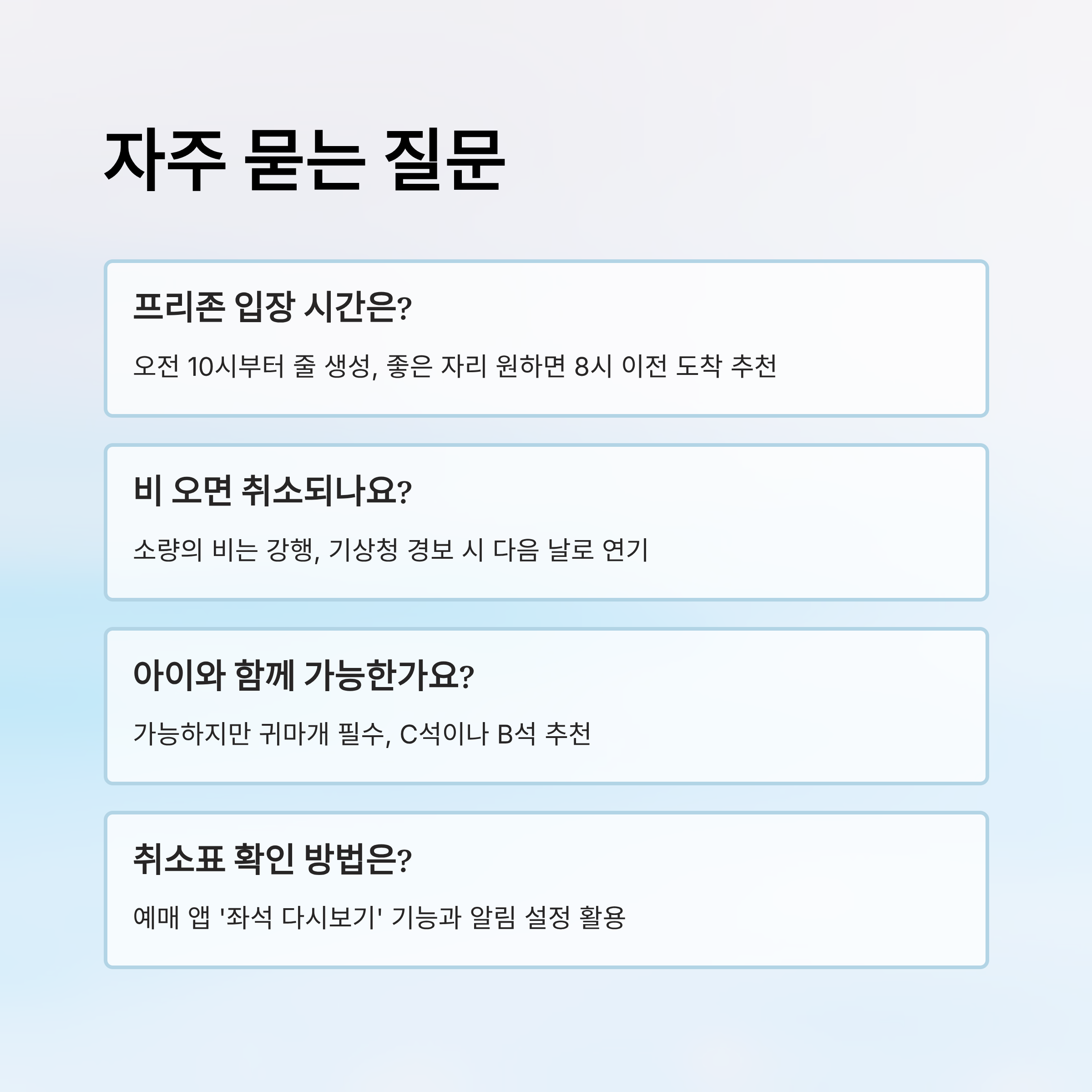 좌석마다 장단점이 달라요. 가족 단위라면 C석이 편하고, 커플 데이트라면 A석이 최고예요. 혼자라면 프리존에서 돗자리 하나 펴고 자유롭게 즐기는 것도 나쁘지 않아요.