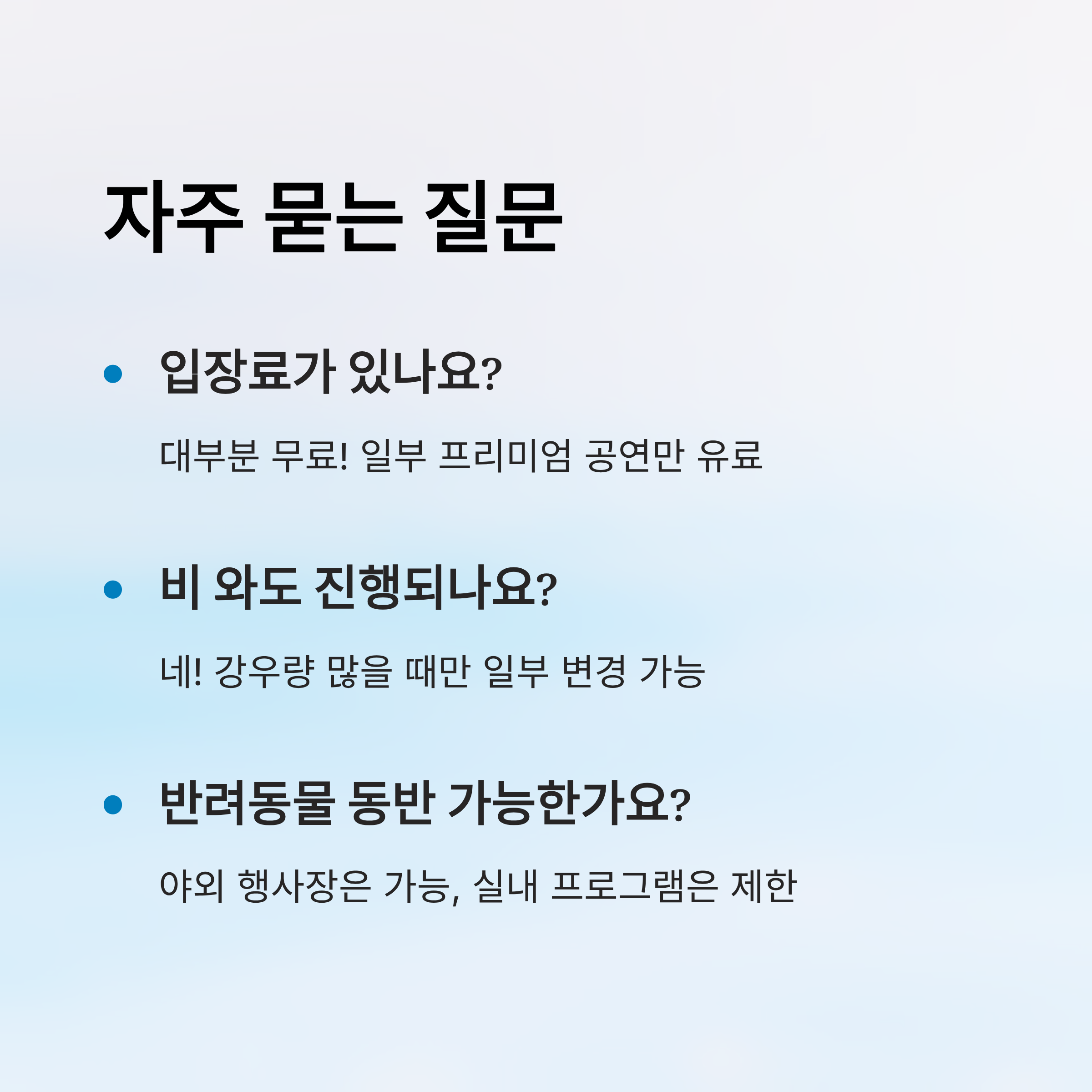 A2. 네! 대부분 실외 프로그램은 우천 시에도 진행돼요. 다만, 강우량이 많거나 기상 악화 시 일부 공연은 시간 변경 또는 취소될 수 있어요. 공식 홈페이지 공지사항 확인은 필수!
