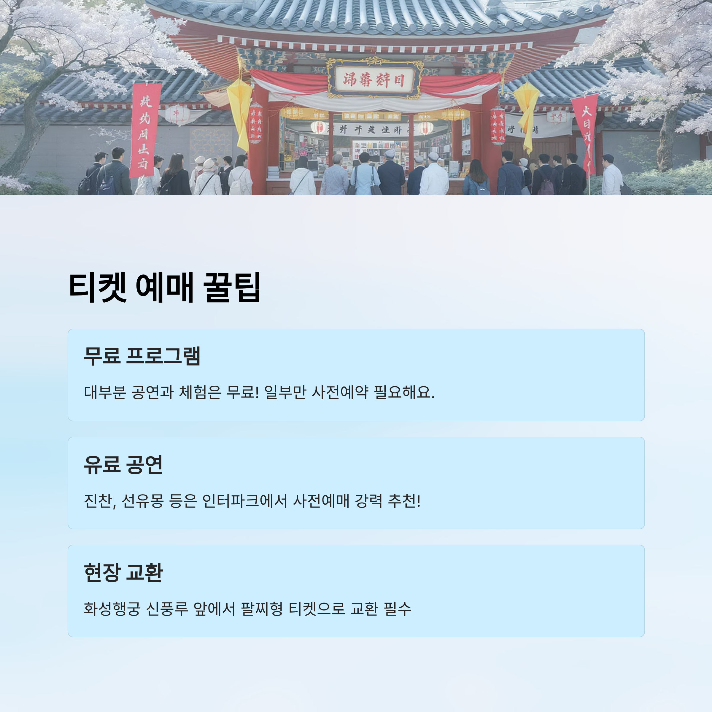 예매 후에는 축제 현장 내 '화성행궁 신풍루 앞 티켓 부스'에서 팔찌형 티켓으로 교환해야 입장할 수 있어요. 줄이 길어질 수 있으니 최소 행사 시작 1시간 전엔 도착하는 걸 추천해요.