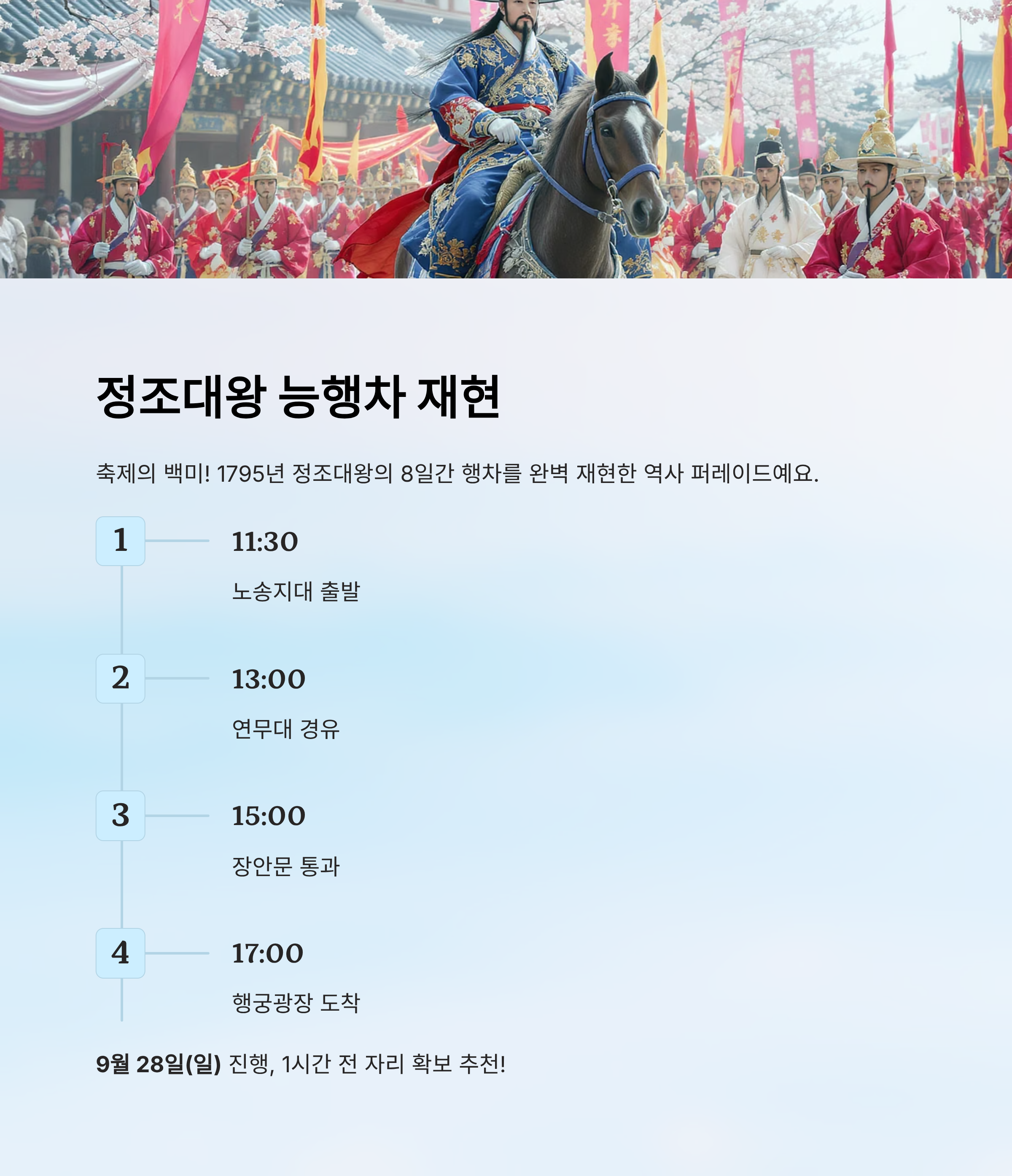 능행차는 단순한 행렬이 아니라, 정조대왕을 중심으로 호위군, 취타대, 무관, 백성, 수레와 깃발 등 당시 의복과 소품까지 고증을 거쳐 정교하게 재현돼요. 특히 말 타고 등장하는 정조대왕의 위엄은 꼭 봐야 할 포인트예요. 📯