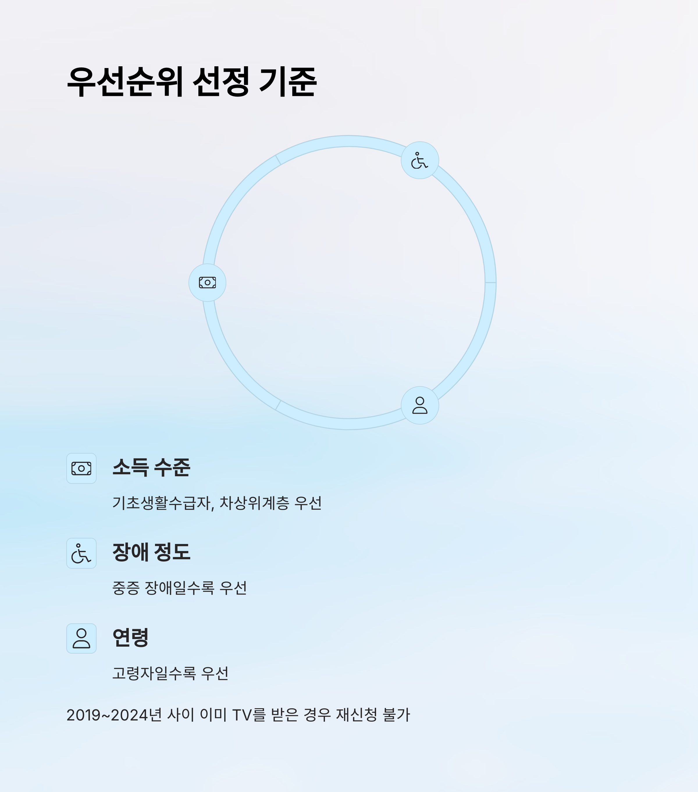 A4. 소득 수준, 장애 정도, 연령을 기준으로 종합 평가하여 우선순위가 결정돼요.