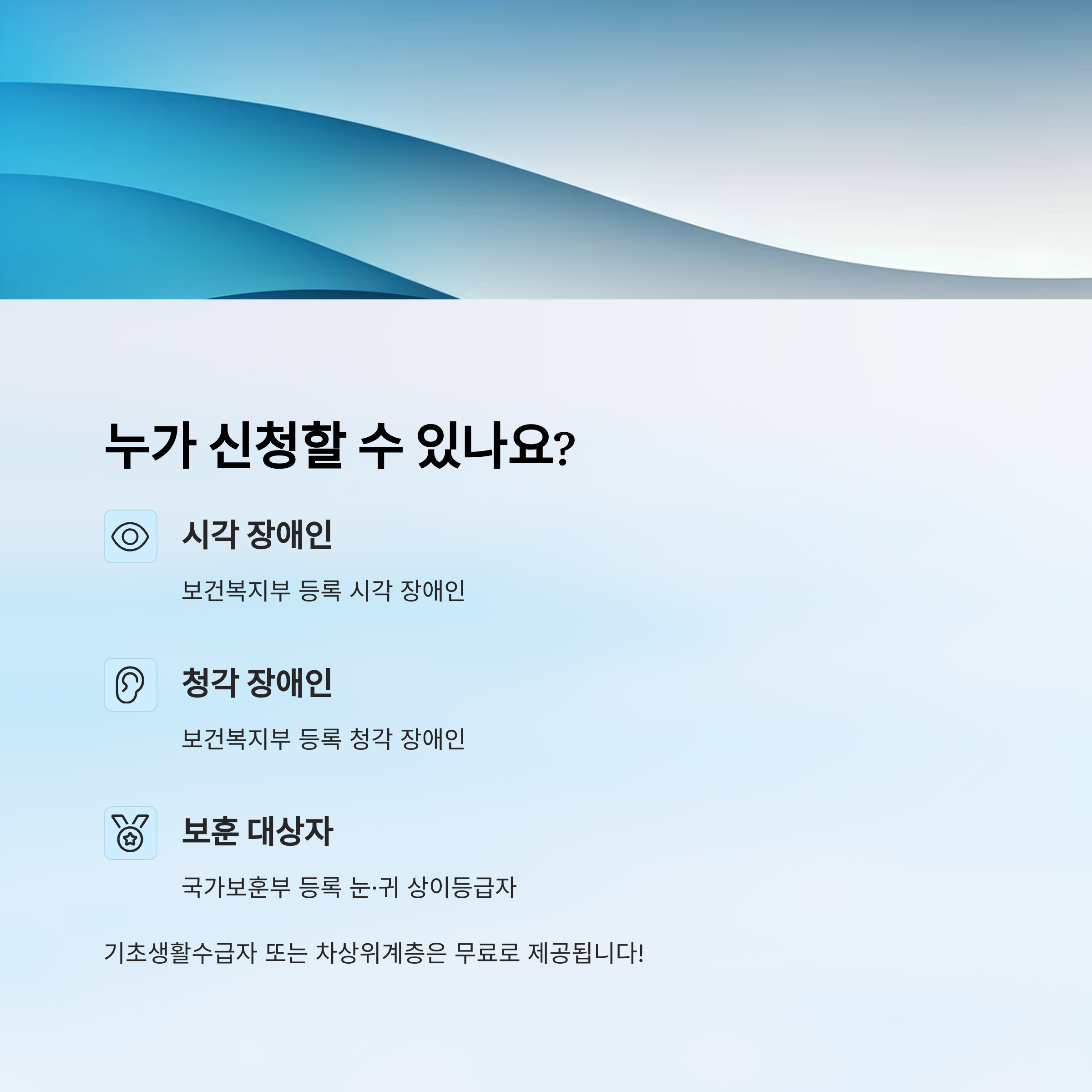 | 보건복지부 등록 시각·청각 장애인 | 가능 | 무상 (저소득층 한정) |