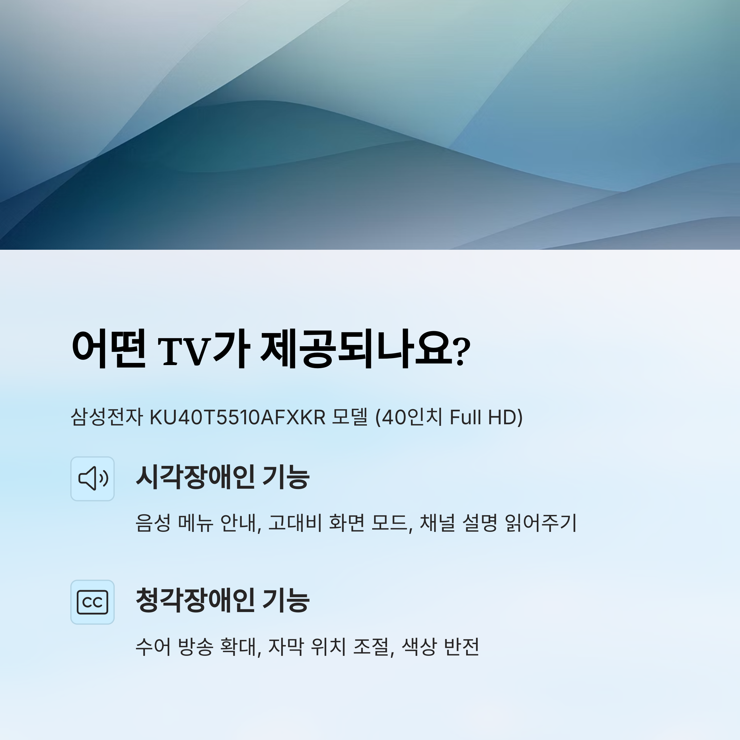 A3. 삼성전자 KU40T5510AFXKR 모델이 제공되며, 음성 안내, 자막 확대, 수어 화면 확대 등의 기능이 탑재돼 있어요.