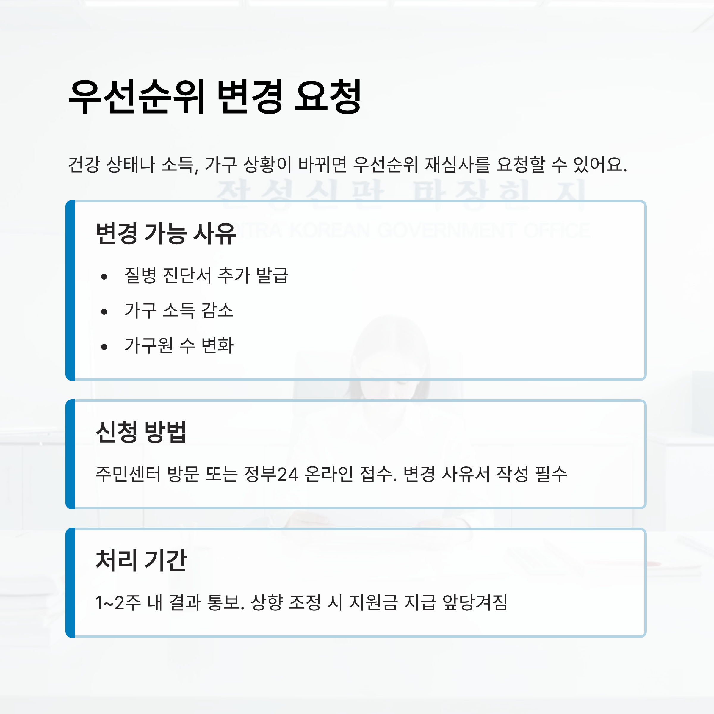 우선순위는 처음 신청할 때의 정보 기준으로 정해지지만, 시간이 흐르면서 건강 상태나 소득, 가구 상황이 바뀔 수도 있어요. 그럴 때 ‘우선순위 변경 요청’을 통해 다시 심사를 요청할 수 있어요. 😊